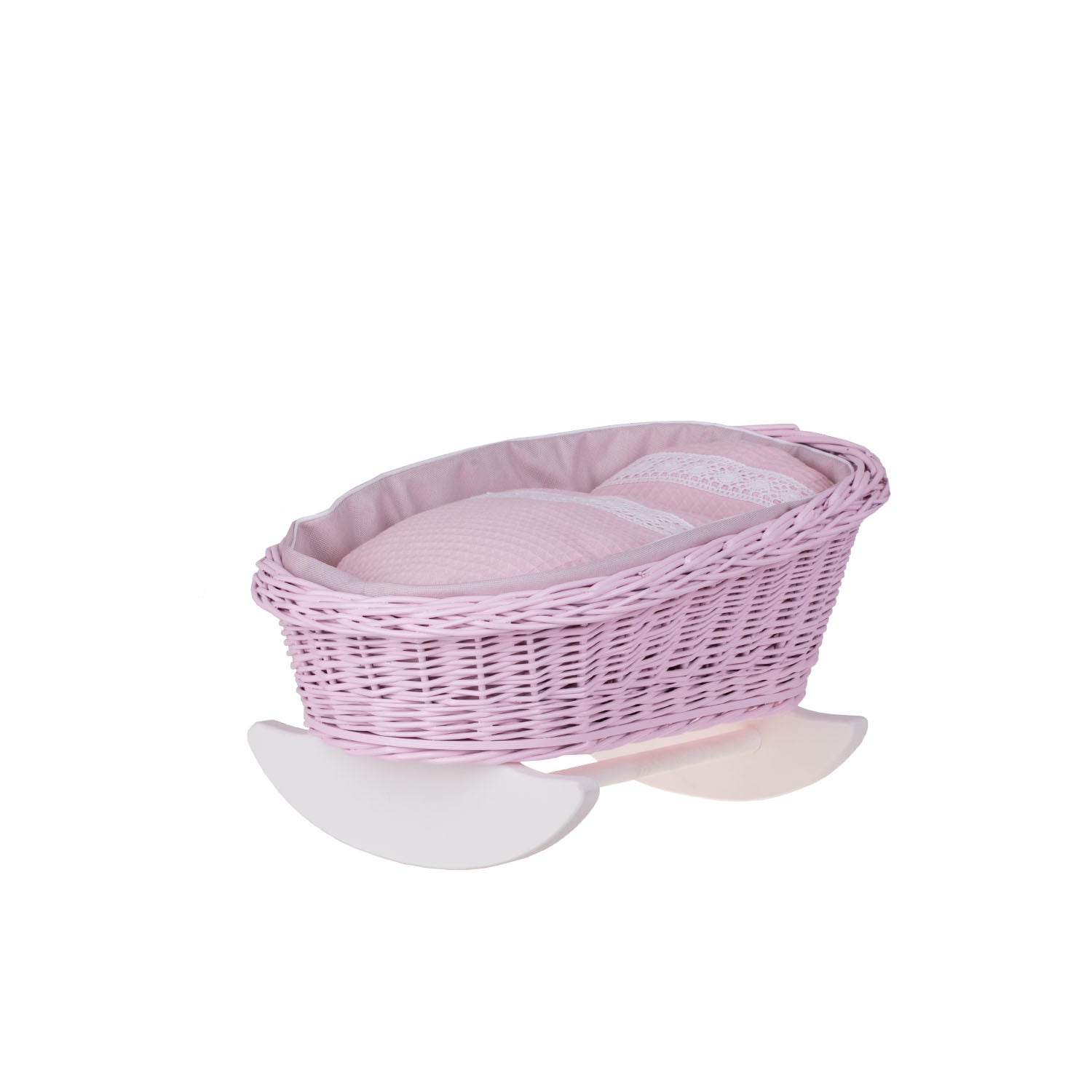 Jouw specificatie van Lili Poppenwagen van wilgentenen met roze bies, inclusief dekentje, kussentje en wiegje.