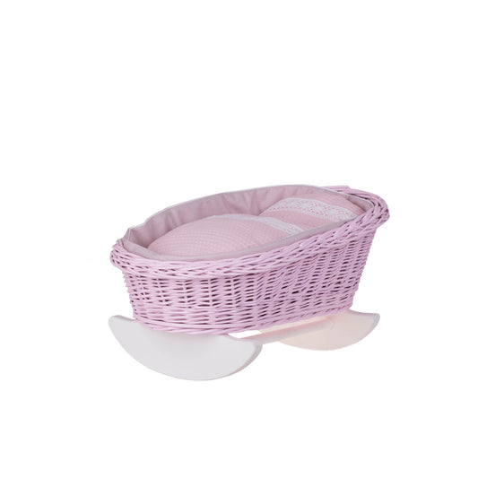 Lili Poppenwagen van wilgentenen met roze bies, inclusief dekentje, kussentje en wiegje.