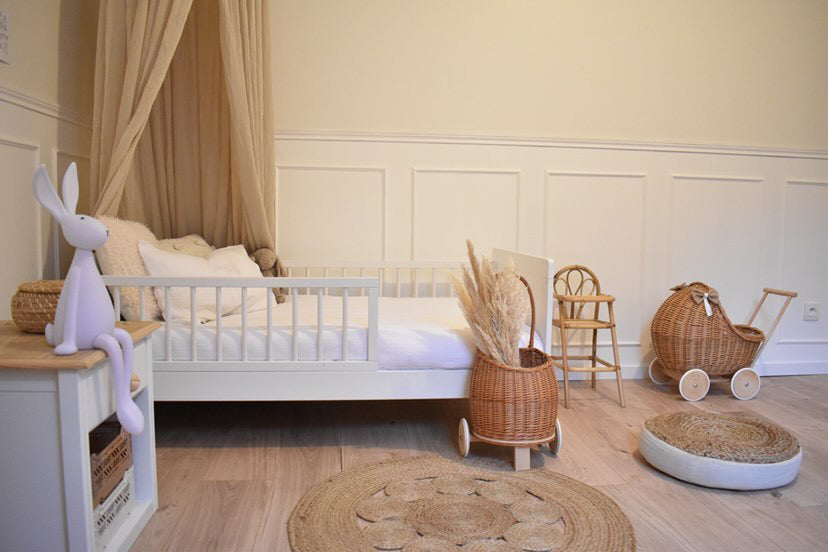 Hij is gemaakt van Europese wilg – een hernieuwbare en milieuvriendelijke grondstof. Elk exemplaar is authentiek handwerk, zorgvuldig geproduceerd binnen de EU zonder schadelijke chemicaliën, daarom is het product veilig voor kinderen en duurzaam voor jarenlang gebruik. De textiele voering is afneembaar en makkelijk te wassen, wat het onderhoud van de hygiëne vergemakkelijkt, zelfs bij intensief gebruik.