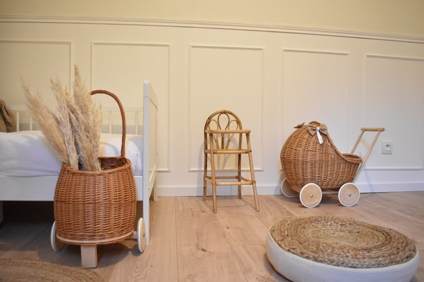 Jouw specificatie van Luke Rieten poppenwagen voor kinderen met blauwe bies, handgreep en houten wielen