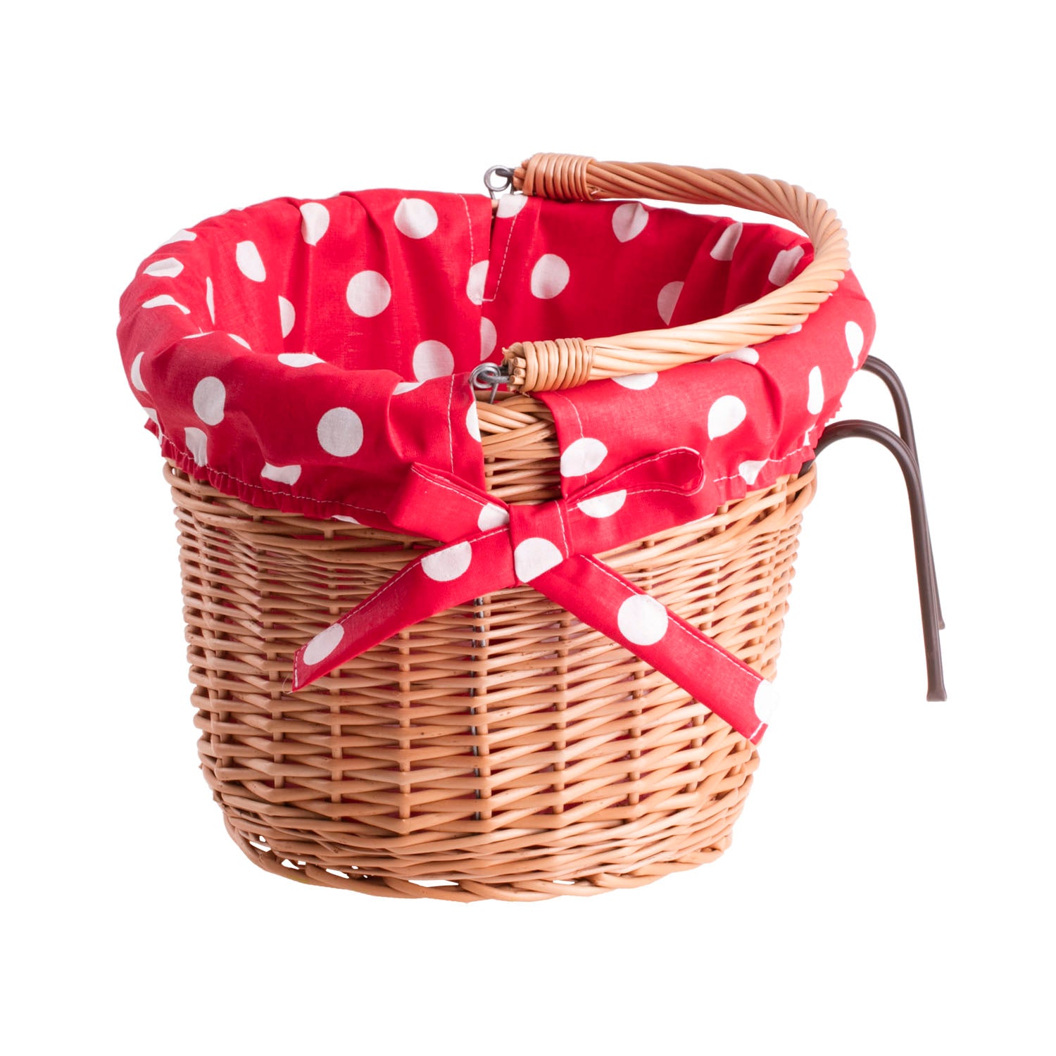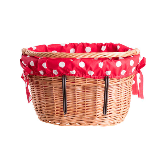 Deze voorste mand van wilgentenen valt op door zijn natuurlijke tint en gelijkmatige, dichte vlecht die een elegante, stevige vorm creëert. De bovenrand is versterkt en het geheel wordt aangevuld met een comfortabel handvat van wilgentenen bevestigd aan metalen ringen. Binnenin bevindt zich een rode katoenen voering die met strikjes is vastgemaakt en de randen en inhoud beschermt. Aan de voorkant en zijkanten zijn zorgvuldig geplaatste latten zichtbaar en alle uiteinden zijn glad, zodat niets blijft haken bij het inleggen van spullen. Aan de achterkant van de mand zijn stalen haakjes gemonteerd voor snelle ophanging aan het stuur.
