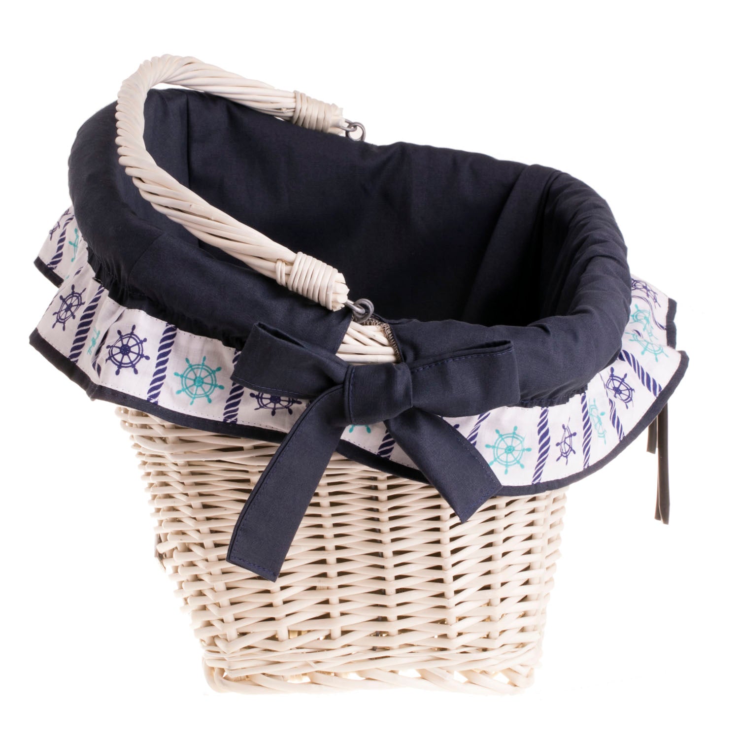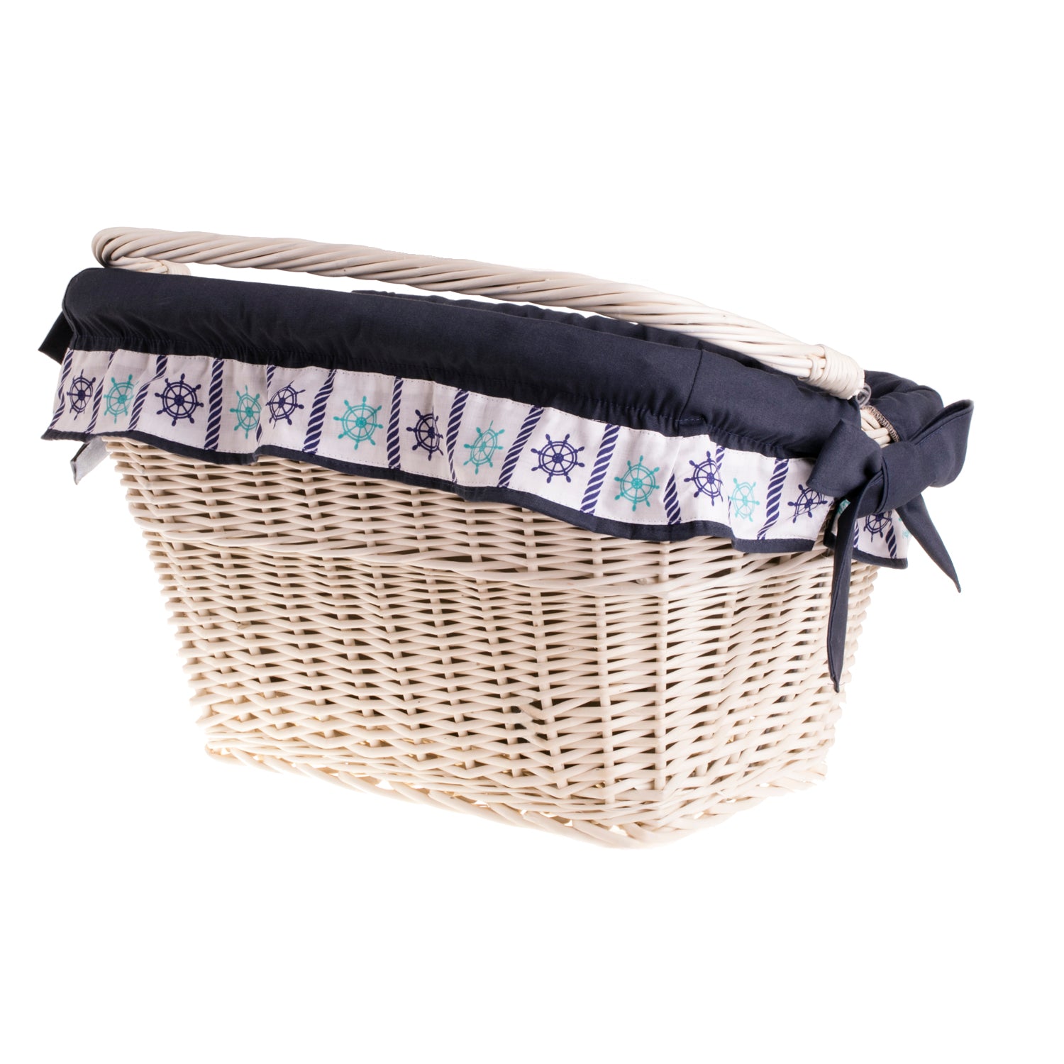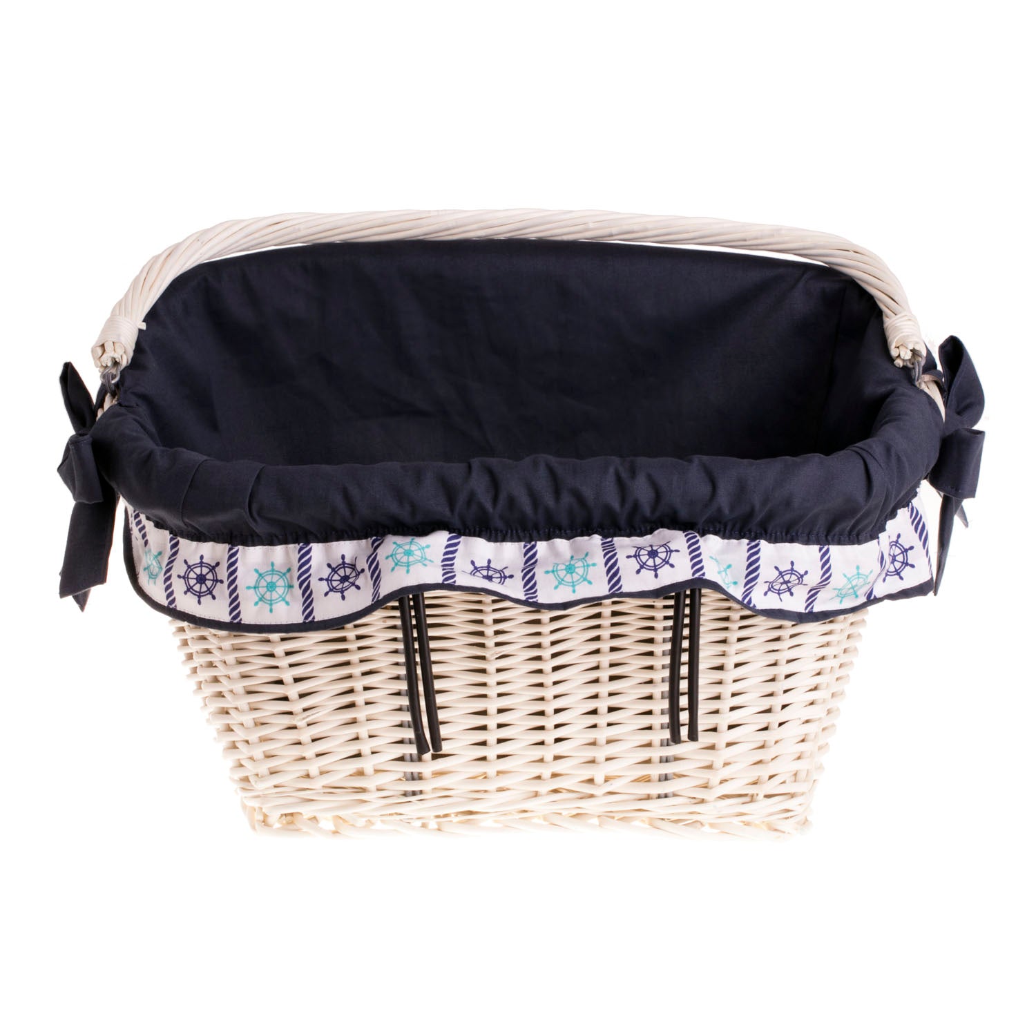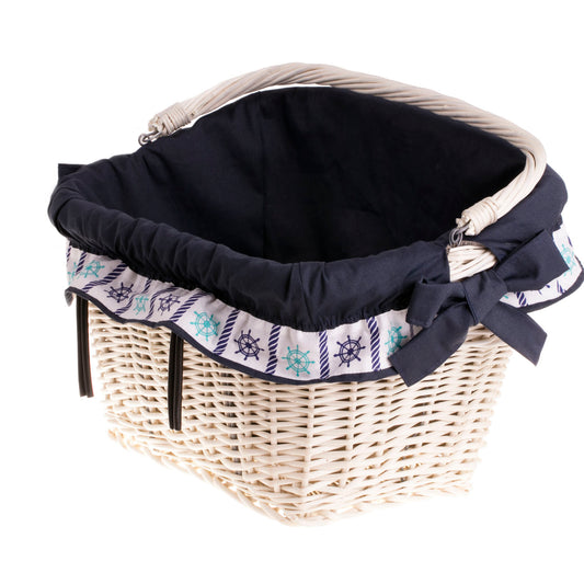 Een klassieke rieten fietsmand voor het stuur in een lichte wilgentoon valt op door het dichte, gelijkmatige vlechtwerk. Hij heeft een stevige, gevlochten draaghengsel voor comfortabel meenemen en een zachte, donkerblauwe katoenen voering met ruches en strikjes. De brede opening maakt inpakken gemakkelijk en de afgeronde rand ligt prettig in de hand.