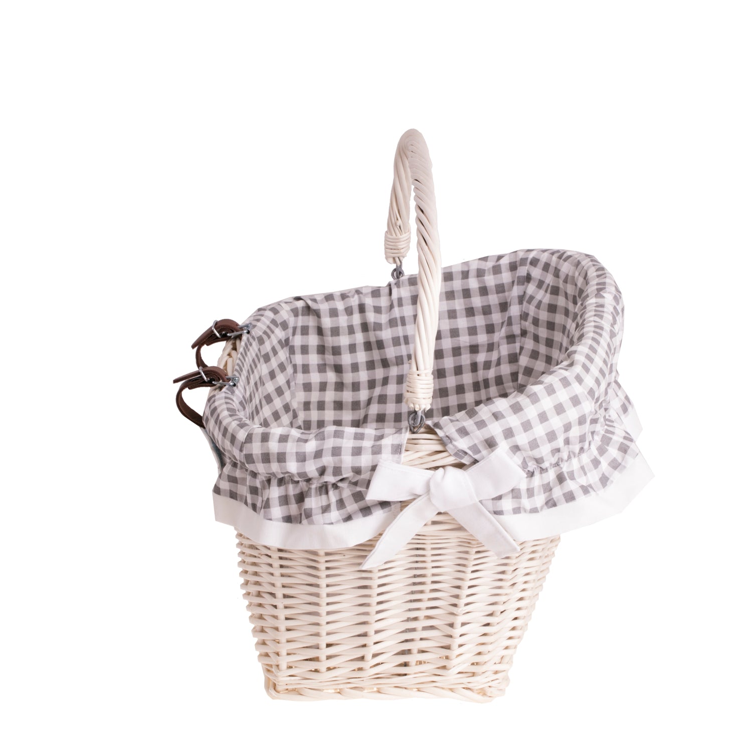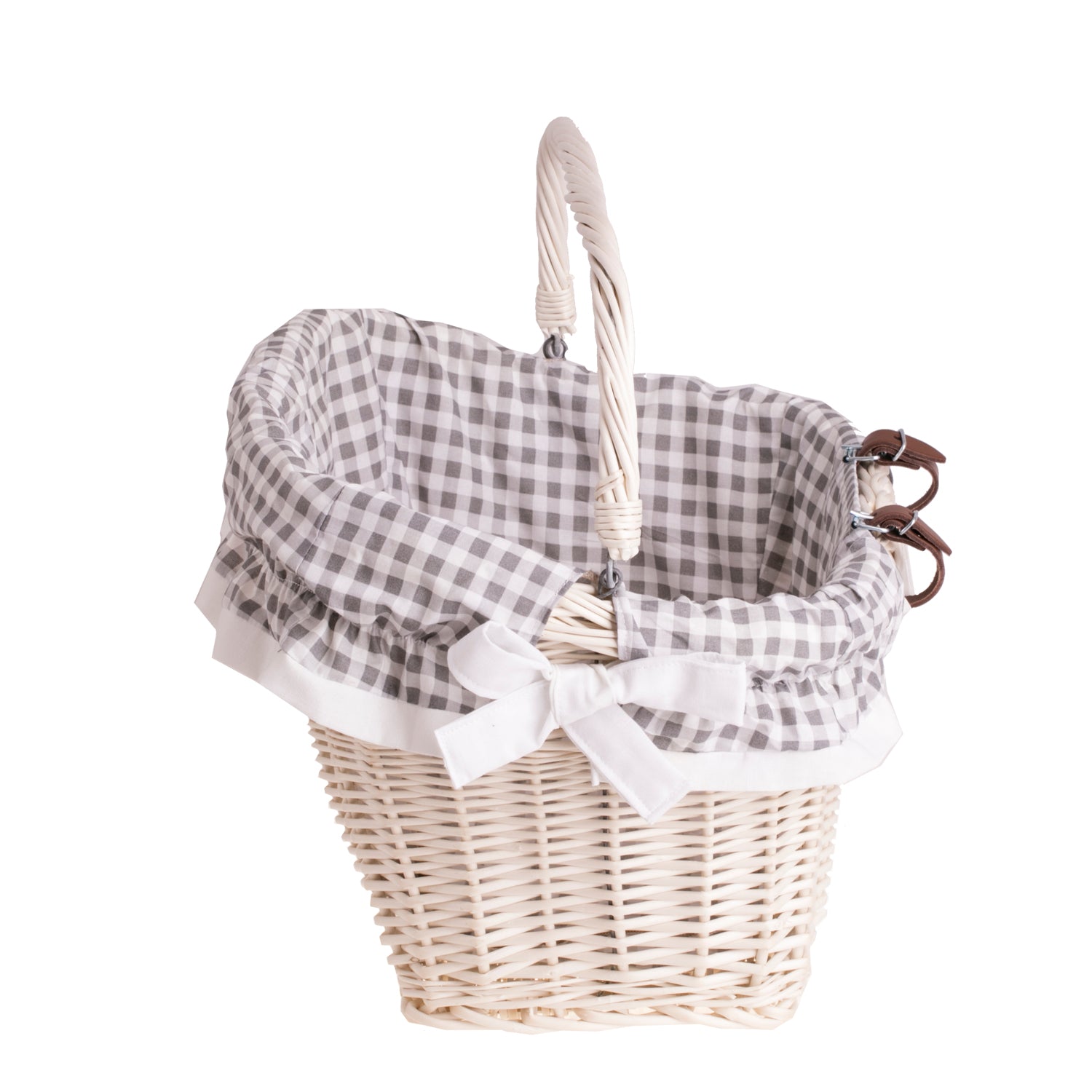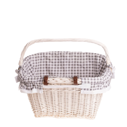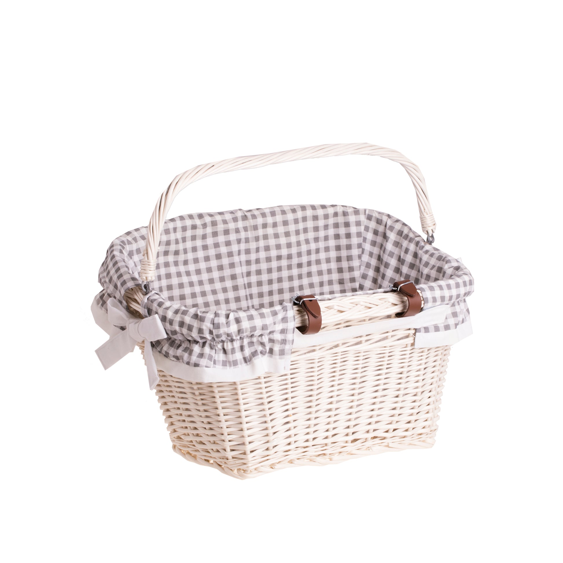 Een elegante rieten fietskorf in een crèmekleurige tint geeft je stadsrit klasse en een licht retro karakter. Hij heeft een ruime, stabiele romp met een gelijkmatige, dichte vlecht en een versterkte rand. Binnenin zit een grijze katoenen voering met decoratieve strikjes die het interieur omhult en de inhoud beschermt. Sluiting met leren banden en een comfortabele handgreep maken het geheel af.