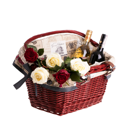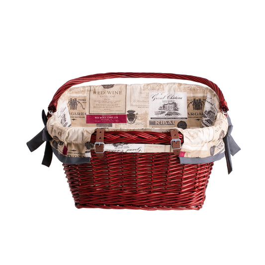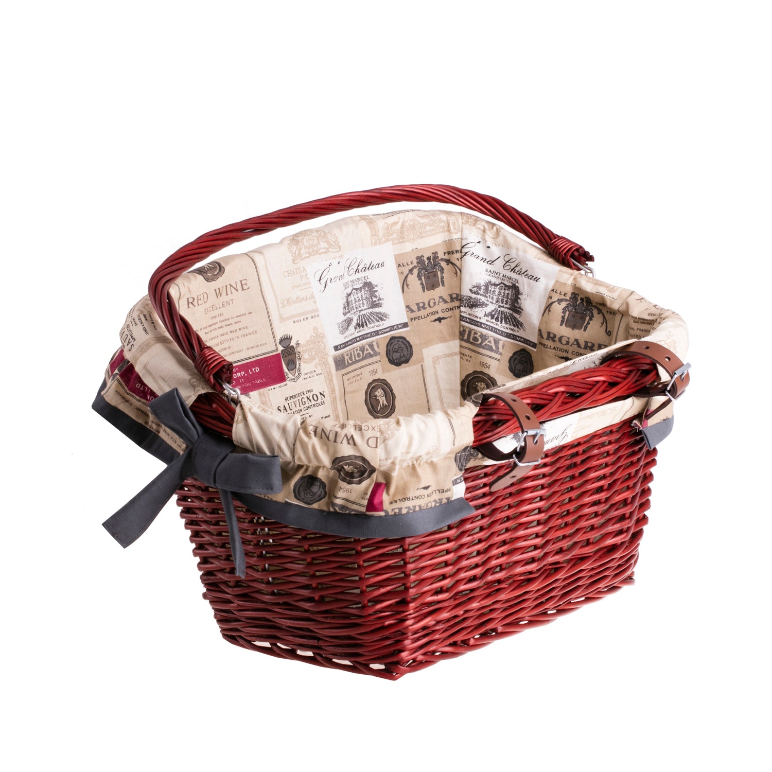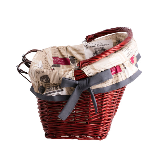 Een stijlvolle gevlochten fietskorf in een diepe, donkerrode tint combineert retro-uitstraling met moderne functionaliteit. De binnenkant is afgewerkt met een zachte, crèmekleurige voering die elegantie toevoegt en de inhoud beschermt. Het buitenste vlechtwerk is gelijkmatig en dicht, en de verstevigde rand zorgt voor stijfheid. De korf is uitgerust met een handig draaghandvat en leren riemen met gespen, waarmee je hem eenvoudig aan het stuur bevestigt. Kleine afwerkingsdetails benadrukken het ambachtelijke karakter en maken dit accessoire een blikvanger.