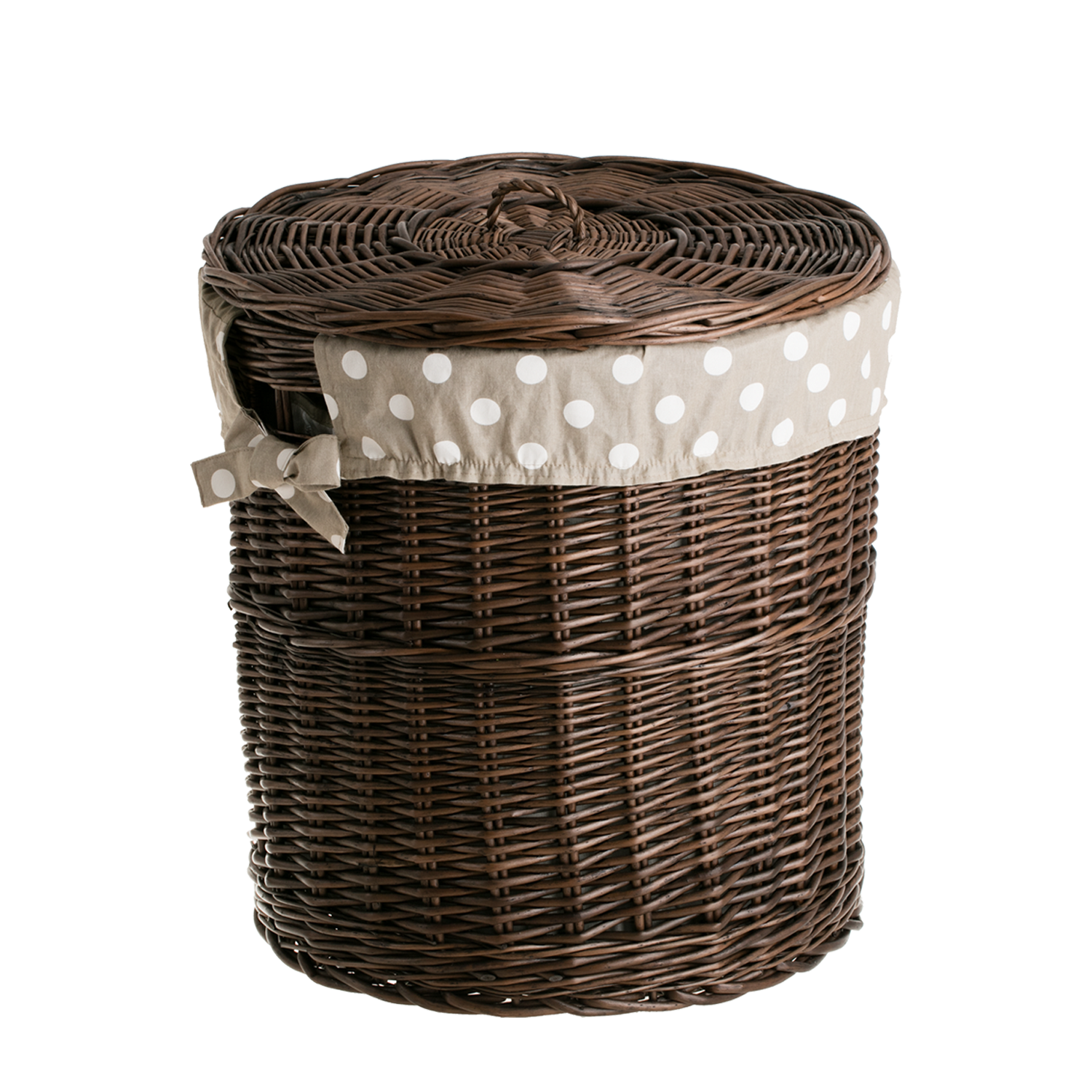 Een elegante gevlochten wasmand in donkerbruin overtuigt met een klassieke, tijdloze uitstraling. De ronde lijn van de wanden en de dichte, gelijkmatige vlecht zorgen voor een stevige vorm met een ordelijke structuur, en de subtiel satijnen kleur benadrukt de tekening van het vlechtwerk. De bovenkant is afgewerkt met een uitneembare crème stoffen bies die een zachte toets toevoegt. Een bijpassend deksel met gevlochten handvat rust stabiel op de rand en bedekt de inhoud op een verzorgde manier.