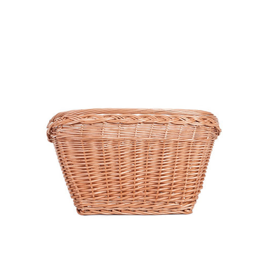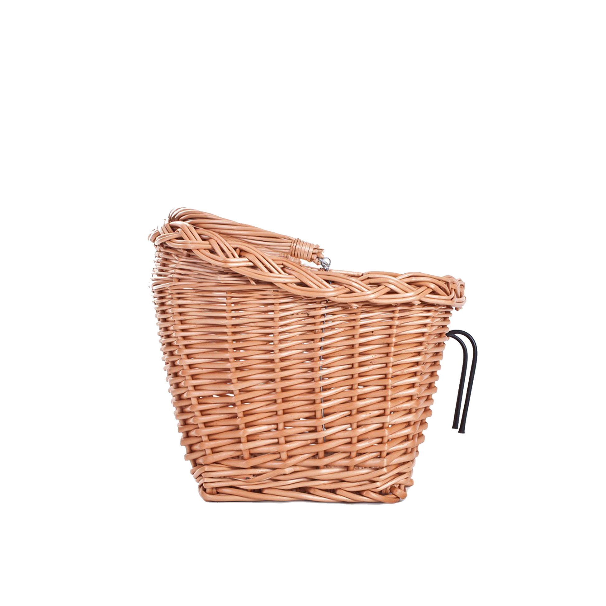 De gevlochten stuurmand van wilgentenen valt op door zijn natuurlijke honingkleur (honiggelb) en de zorgvuldige weving van volle wilg. De bovenrand is versierd met een dubbele decoratieve vlecht die de constructie verstevigt en het retrokarakter benadrukt. Aan de zijkanten zitten twee stalen haken met kunststof beschermlaag en aan de binnenzijde is een comfortabele draaghendel verborgen. Het profiel van de mand loopt licht naar boven uit, wat het inpakken vergemakkelijkt en helpt om de inhoud tijdens het rijden op zijn plaats te houden.
