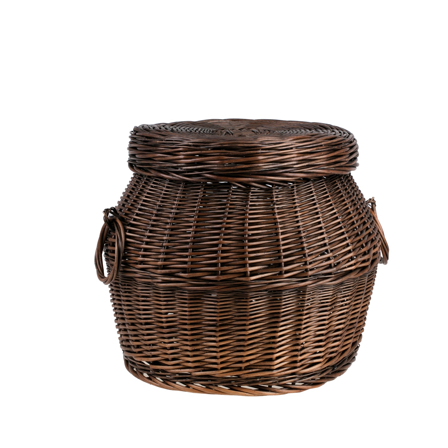Een kleine gevlochten wasmand die betovert met zijn compacte silhouet en een elegante, donkerbruine kleur die gezelligheid aan het interieur toevoegt. Het korpus is gevlochten in een gelijkmatig, dicht patroon met een decoratieve overgang in het midden, waardoor het oppervlak esthetisch en vervormingsbestendig is. Het nauwsluitende deksel sluit aan op de rand van de mand en een praktisch handvat maakt het optillen gemakkelijk. Zorgvuldig afgewerkte randen beschermen de stoffen.