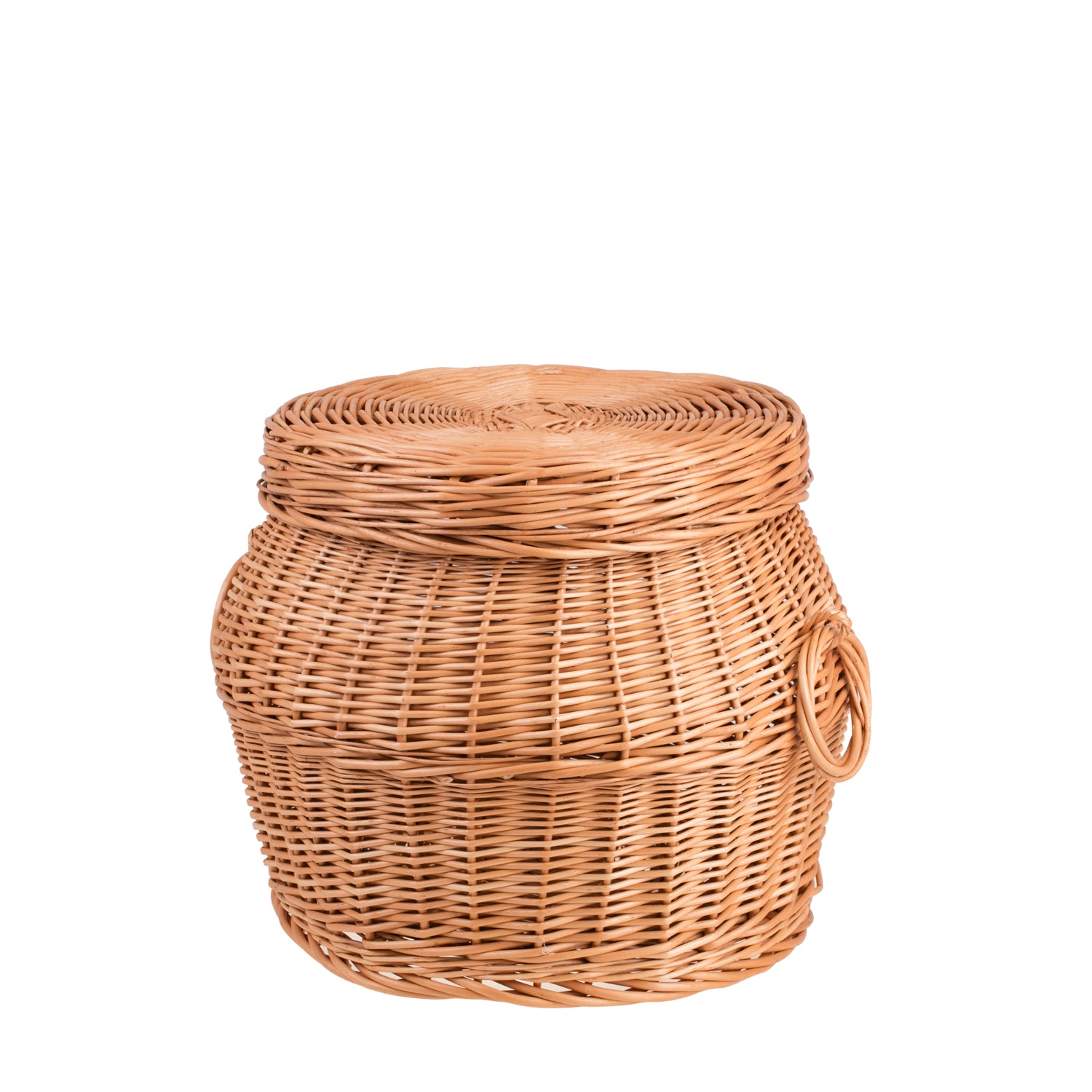Deze kleine wasmand van wilgentenen valt op door zijn licht bolle profiel en de warme honingkleur van het natuurlijke riet. Een gelijkmatige, stevige vlecht creëert een glad oppervlak en het bijpassende deksel sluit het geheel esthetisch af. Aan de zijkanten zitten comfortabele ringhandgrepen die het verplaatsen vergemakkelijken. Zacht afgeronde randen en een zorgvuldig afgewerkte rand benadrukken de degelijkheid van de afwerking.