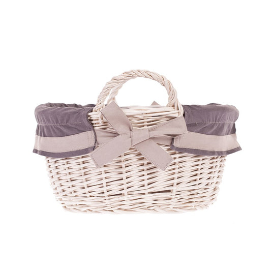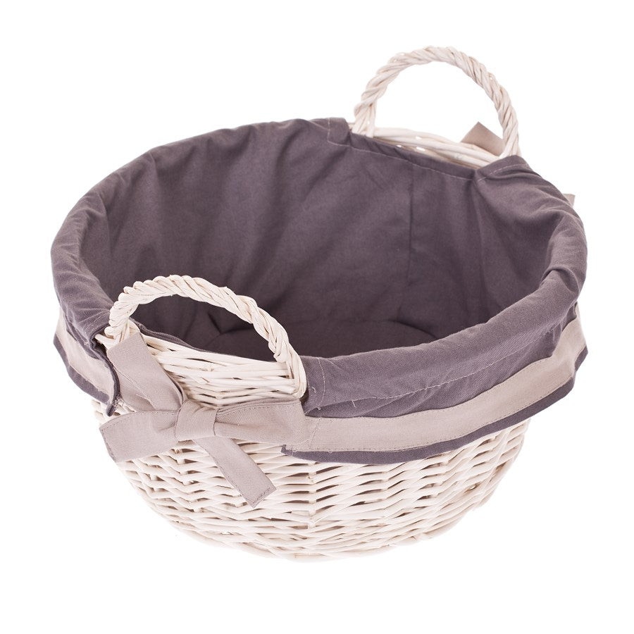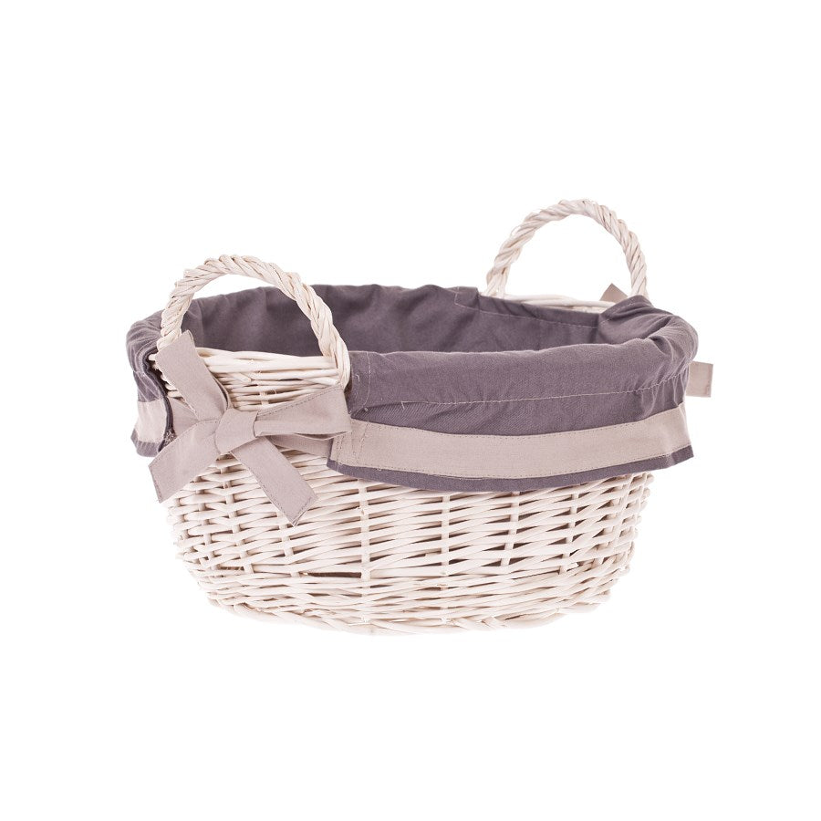 Een elegante rieten mand in een crèmekleurige tint valt op door een zachte, grijze rand met vastgeknoopte strikken en een decoratieve lijst. Twee stevige, geschroefde handvatten maken het mogelijk de inhoud gemakkelijk te dragen en de gelijkmatige vlecht zorgt voor stabiliteit en esthetiek. Gladde randen voelen prettig aan en zijn veilig voor textiel. De mand is gevlochten van geselecteerde stokken met een subtiele, natuurlijke glans, waardoor hij uitstekend past in gezellige, huiselijke interieurs.