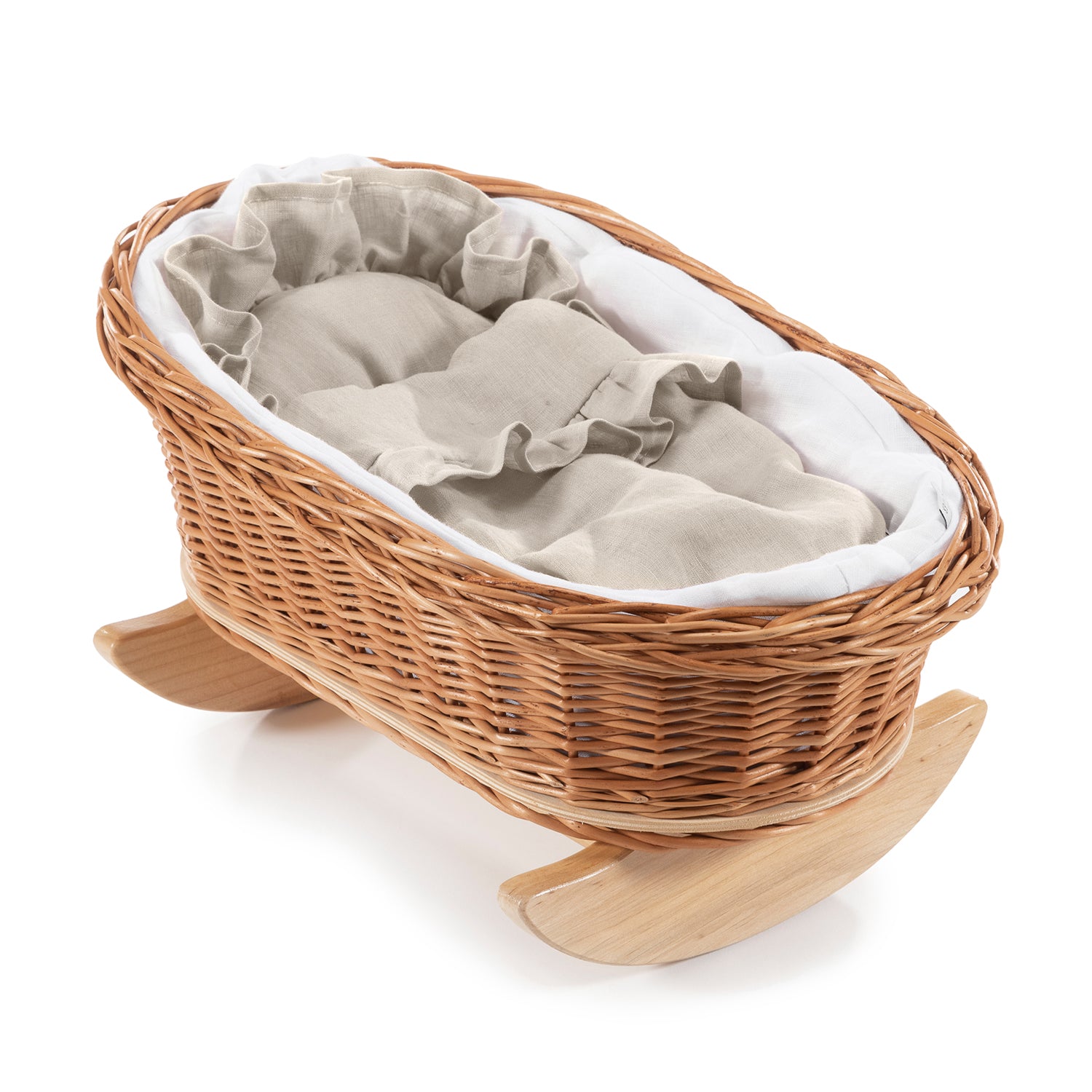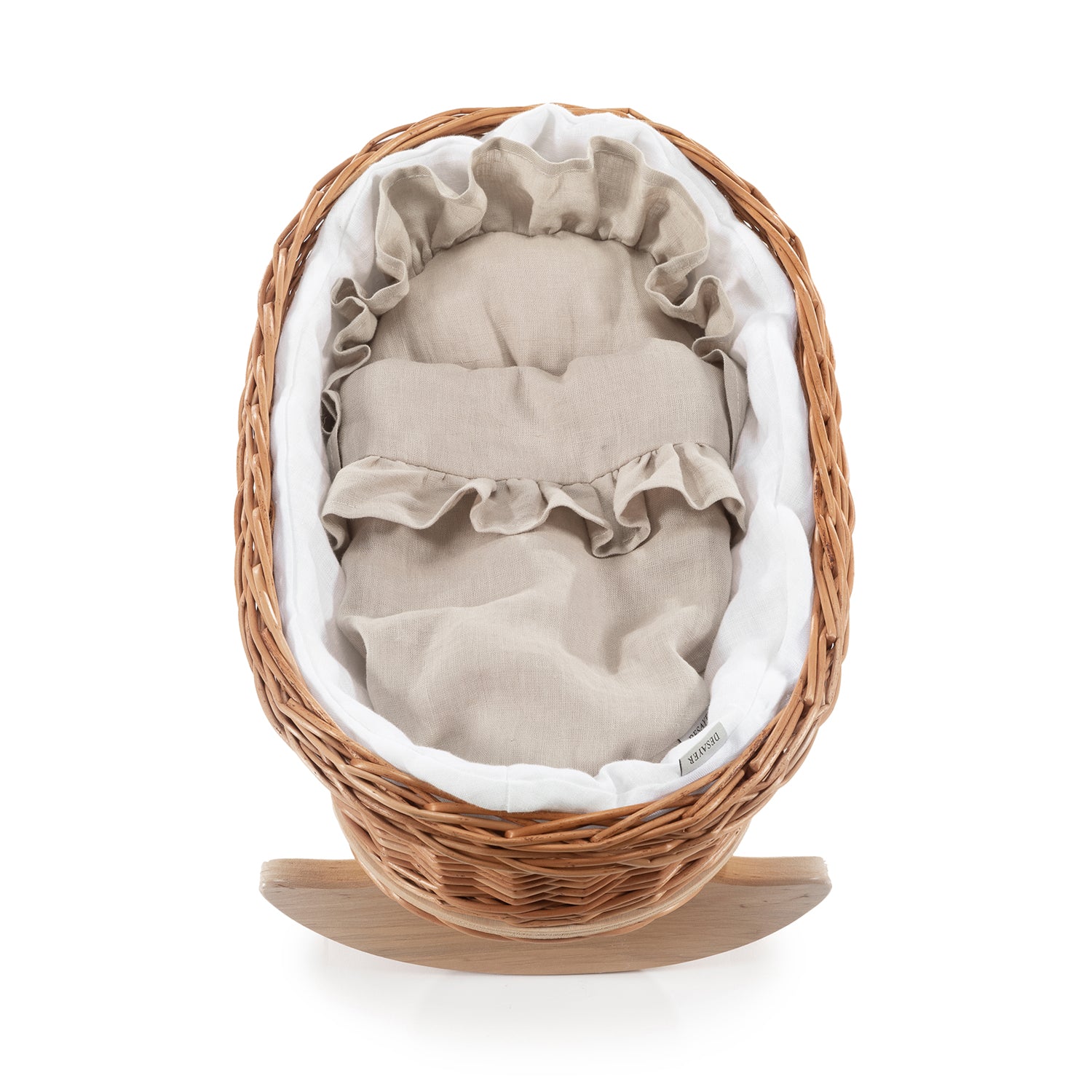 Elk stuk is gemaakt als handgemaakt – de wieg is met de hand gevlochten van Europees riet afkomstig uit hernieuwbare teelten. De glijders zijn gemaakt van duurzaam beukenhout en het interieur is bekleed met linnen gecertificeerd volgens OEKO-TEX Standard 100. Natuurlijke materialen zijn milieuvriendelijk voor in huis, elegant en tijdloos, en tegelijkertijd zeer duurzaam.