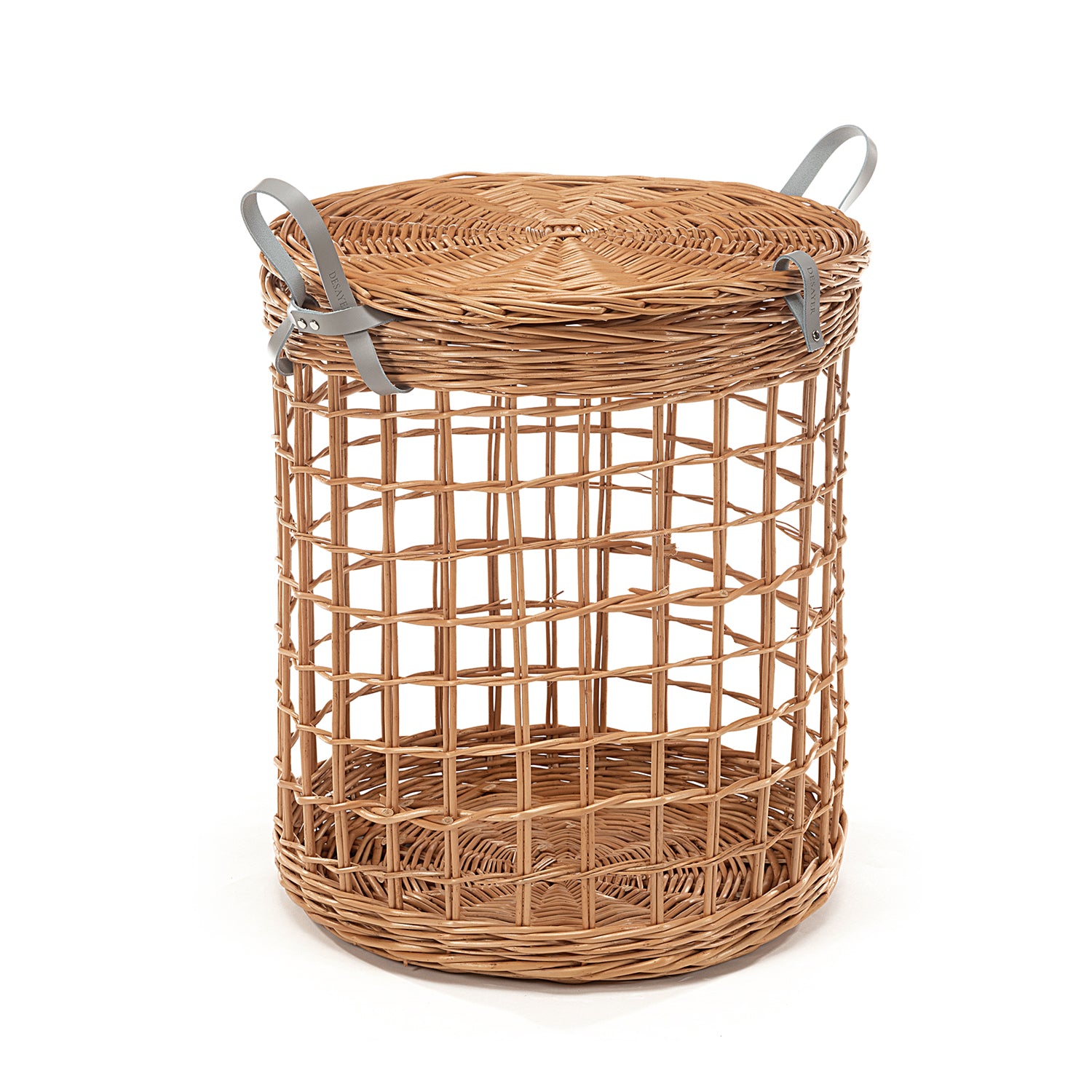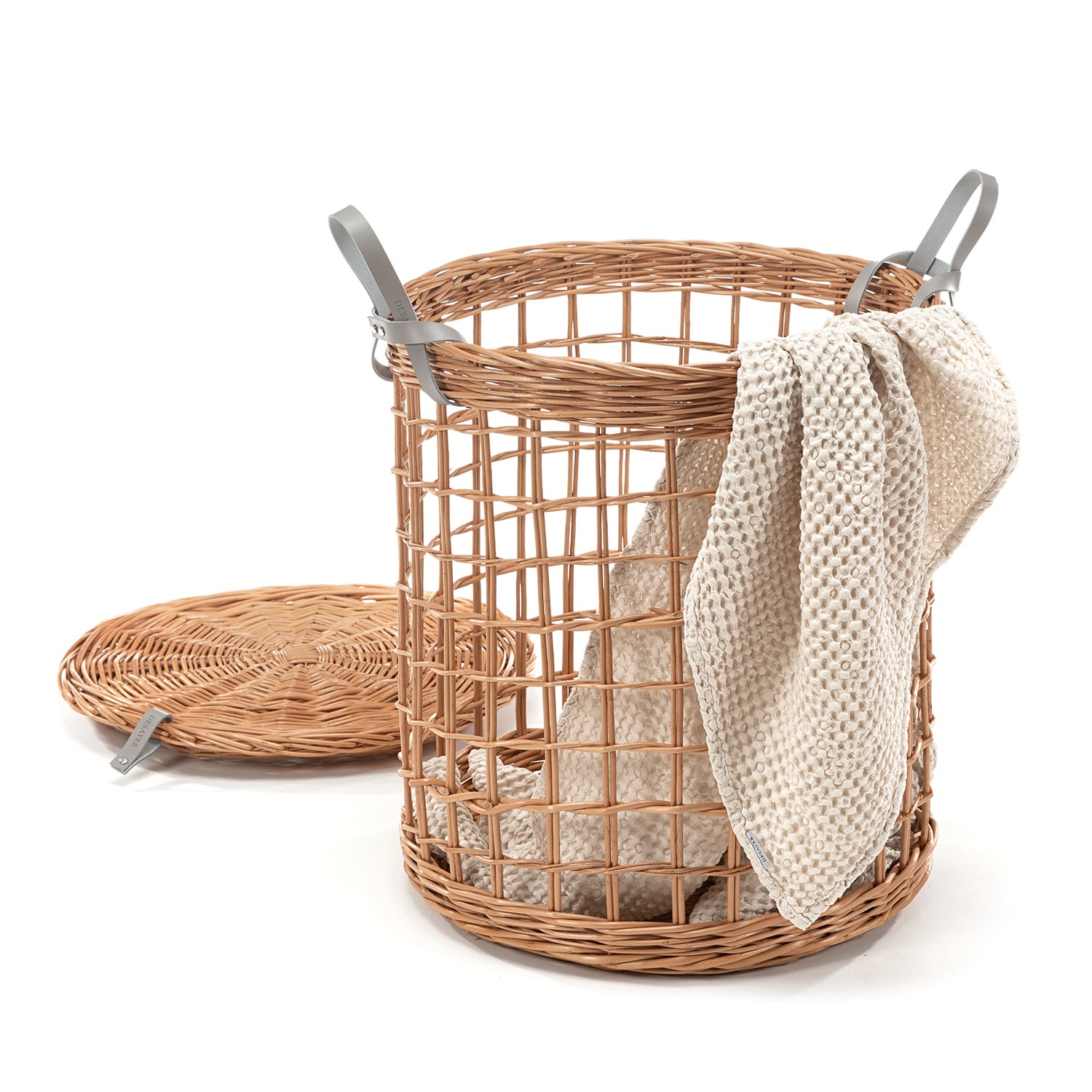 DESAYER is een opengewerkt rotanmandje met deksel dat lichtheid van vorm combineert met degelijkheid. De cilindrische vorm is gevlochten in een luchtig net, waardoor de inhoud kan ademen en zichtbaar blijft. De natuurlijke rotankleur verwarmt de ruimte, en de stevige, dichter gevlochten bodem en het platte, fijn gedraaide deksel benadrukken het ambachtelijke karakter. Twee zilvergrijze leren handgrepen voegen elegantie en gemak toe.