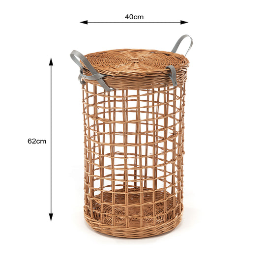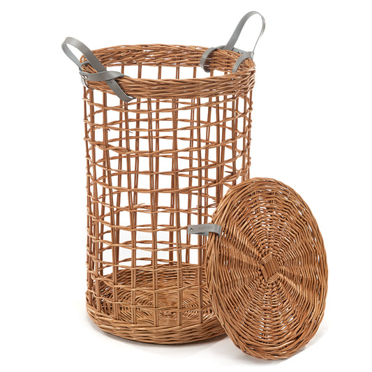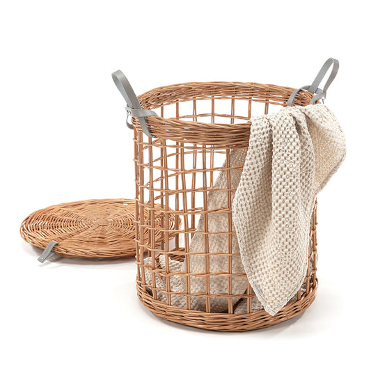 Het deksel beschermt de binnenkant tegen stof en het handvat in het midden maakt hem eenvoudig te verwijderen of op te hangen. Twee sterke, gestikte leren handgrepen maken dragen met één of beide handen mogelijk. Verkrijgbaar in twee maten: Ø 40 cm, hoogte 60 cm + 2 cm deksel en Ø 45 cm, hoogte 50 cm + 2 cm deksel (tolerantie +/- 2 cm). De maximale belasting van de mand is 5 kg, wat veilig dagelijks gebruik thuis en op het werk ondersteunt.