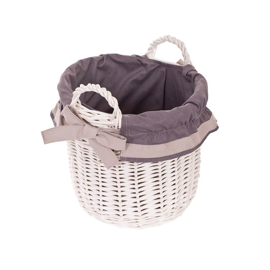 Deze elegante rietenmand valt op door zijn gebleekte vlechtwerk en de zorgvuldig afgewerkte rand. De binnenzijde is gevoerd met een zachte grijze afwerking, afgewerkt met een decoratieve bies en strik die een subtiel accent geven. Twee stevige, gedraaide handgrepen maken het dragen en plaatsen eenvoudig. Gladde afwerking en een stabiele bodem zorgen voor comfort in huis.