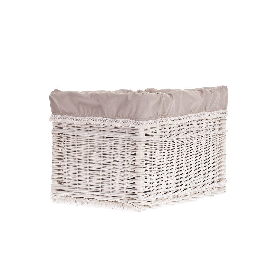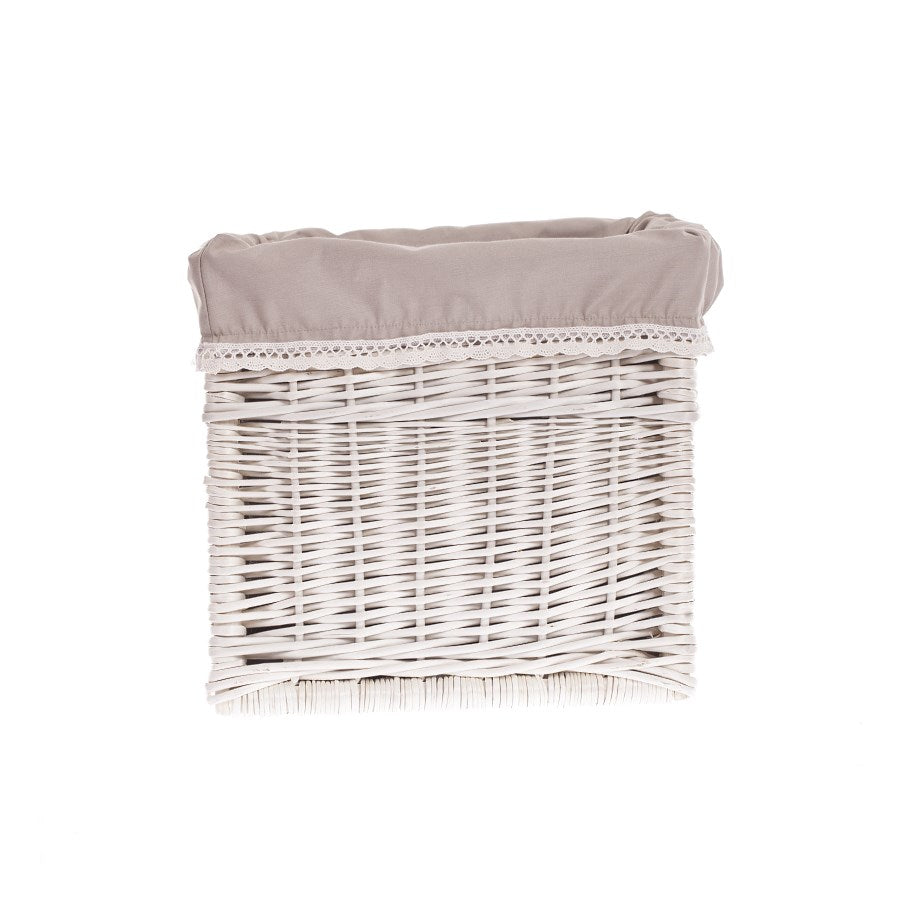 Elegant, rietmand voor op de plank in een gebleekte, crèmige rietkleur trekt de aandacht met zijn strakke, tijdloze lijnen. Een dichte, gelijkmatige vlecht en een stabiele bodem zorgen voor uitstekende stijfheid, en glad afgewerkte randen verhogen het gebruikscomfort. Binnenin bevindt zich een uitneembare grijze stoffen voering, aan de voorkant versierd met een subtiel strikje, dat een zachte charme toevoegt.