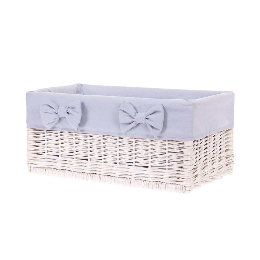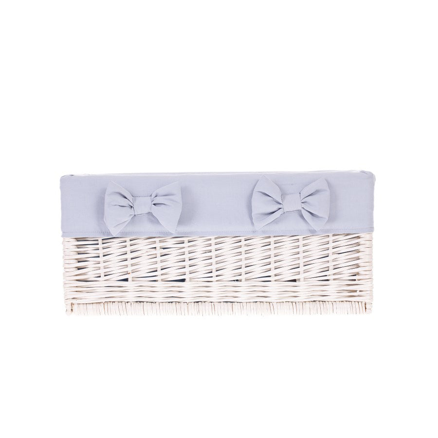 Jouw specificatie van Nova rieten opbergmand voor op een rek met grijze stofbies en strikjes