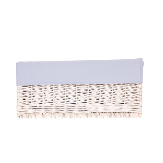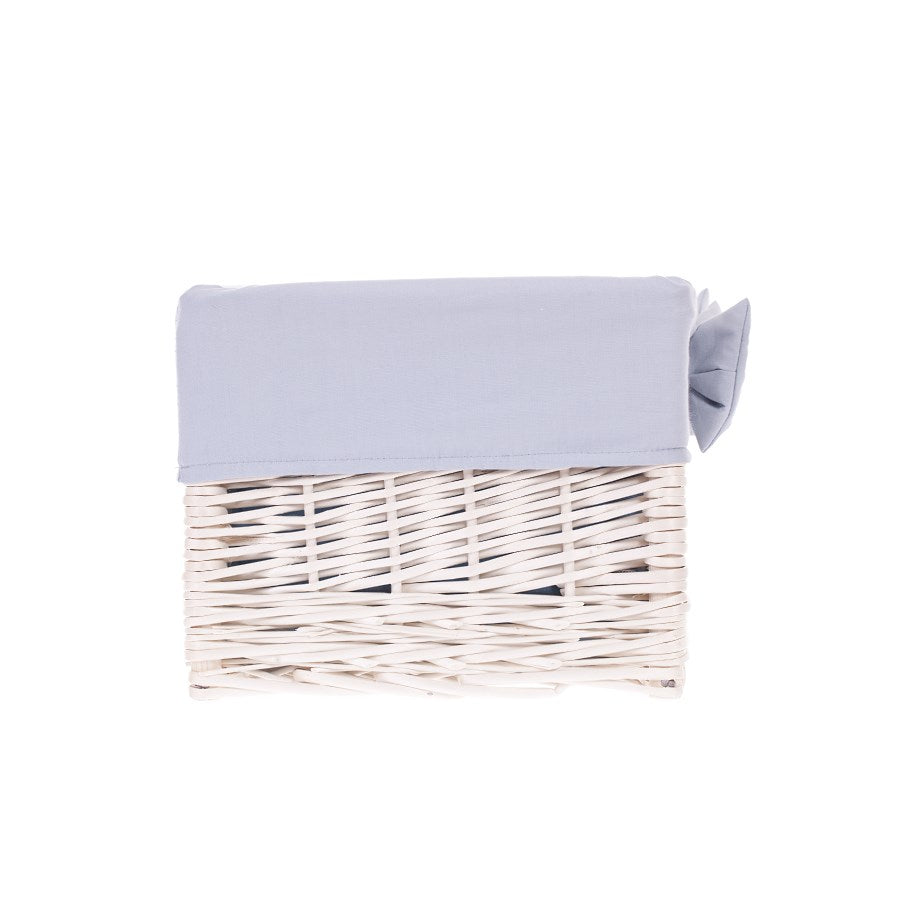 Deze elegante rieten mand is een klassieke retro-stijl organizer voor op een plank. Het met de hand wit geschilderde riet vormt een dichte, gelijkmatige vlecht, en de bovenrand is afgewerkt met een uitneembare, zachte grijze voering. Voorop siert het mandje twee subtiele strikjes die lichtheid en charme toevoegen. Simpele lijnen en perfect afgewerkte randen zorgen ervoor dat de mand netjes oogt in elk interieur. De binnenkant is zacht gevoerd, waardoor delicate spullen veilig zijn.