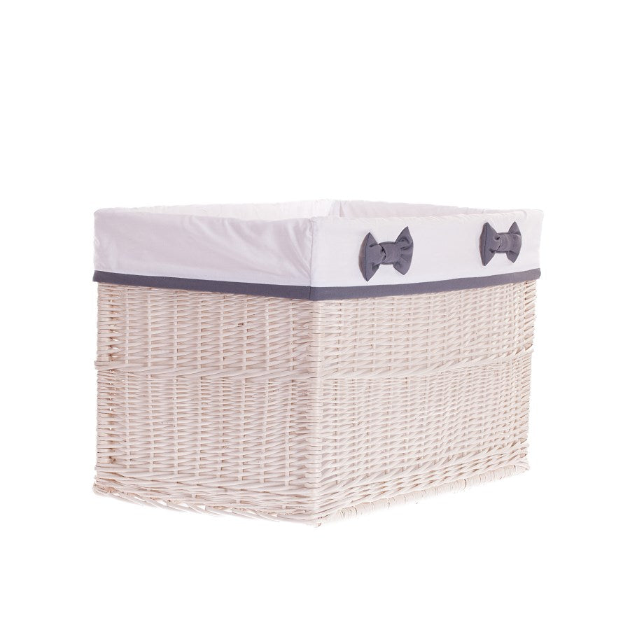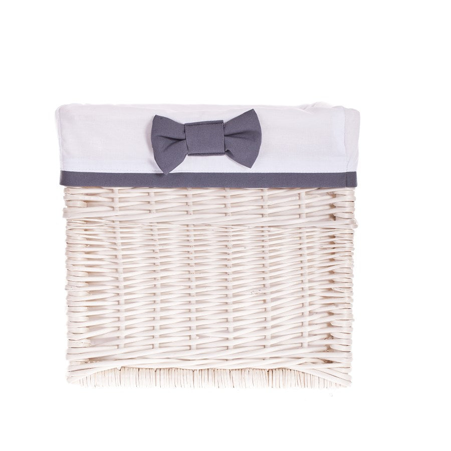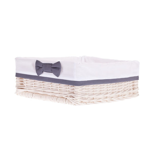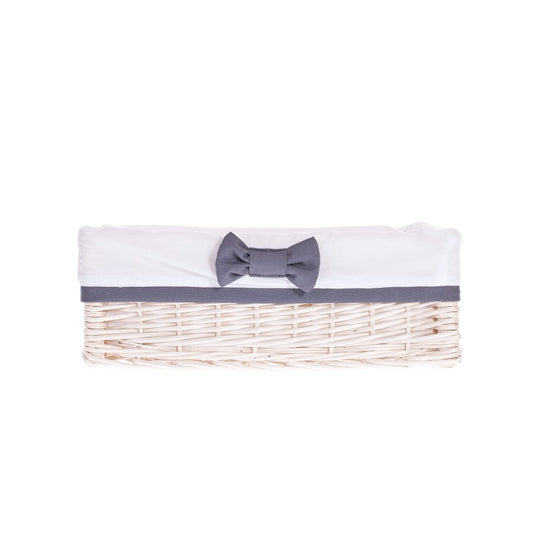 De set functioneert als een veelzijdige opbergorganizer. In de woonkamer zet het afstandsbedieningen, spelletjes en textiel op orde; op de slaapkamerplanken sorteert het ondergoed en accessoires; in de badkamer verzamelt het cosmetica en kleine handdoeken. De witte voeringen zijn zacht voor de inhoud en meubels, verbergen het interieur van de manden, en de grijze bies en strikjes vormen een samenhangende decoratieve toets die gemakkelijk op de inrichting aan te passen is.