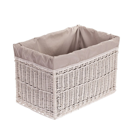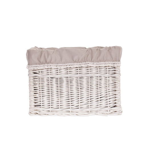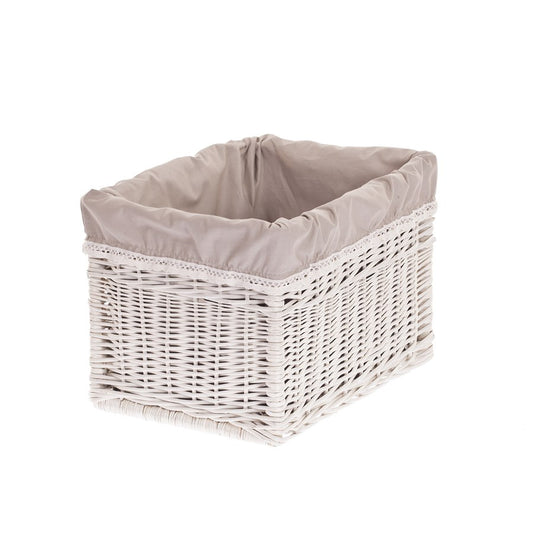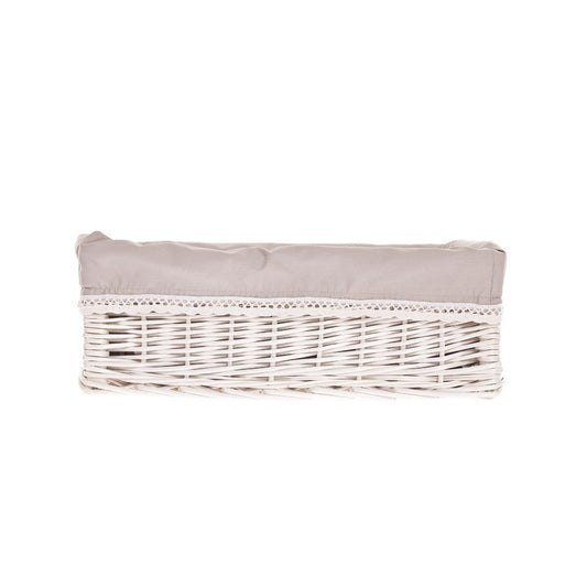 Set van drie schapmanden van gebleekte wilgentenen dat betovert met een rustige esthetiek en veel aandacht voor detail. Elke mand heeft een rechthoekige vorm met een gelijkmatige, dichte vlecht en een keurig afgewerkte rand. De binnenkant is bekleed met een beige, uitneembare voering waarvan de brede omslag elegant over de rand valt. Subtiele kleurverschillen benadrukken het authentieke karakter. Het eenvoudige ontwerp zonder handvatten past makkelijk in veel interieurstijlen.