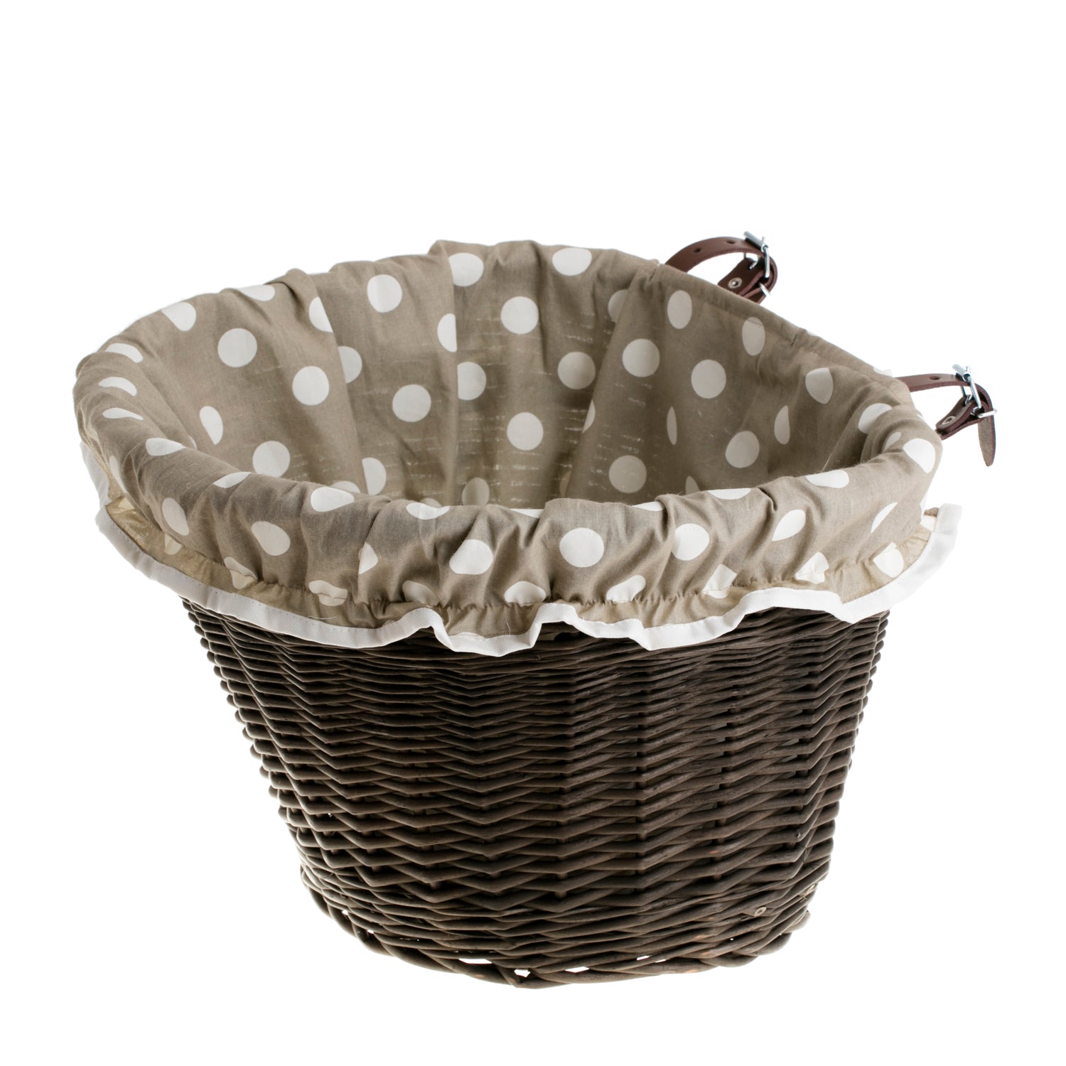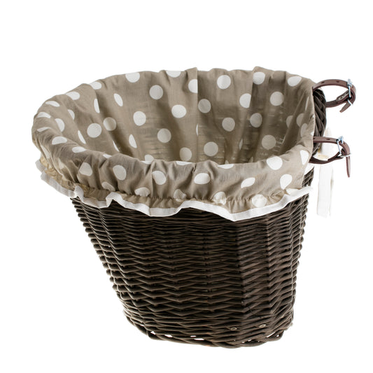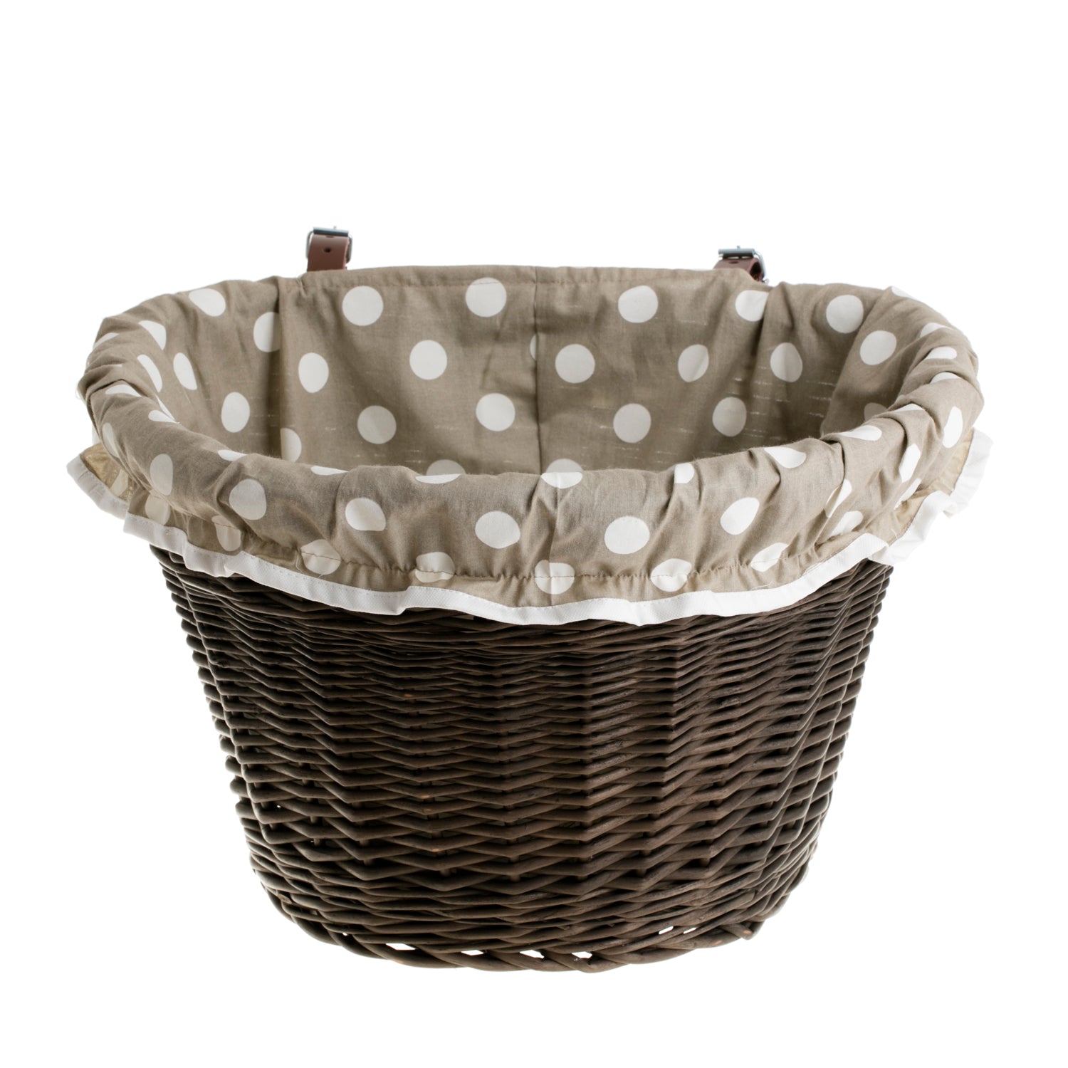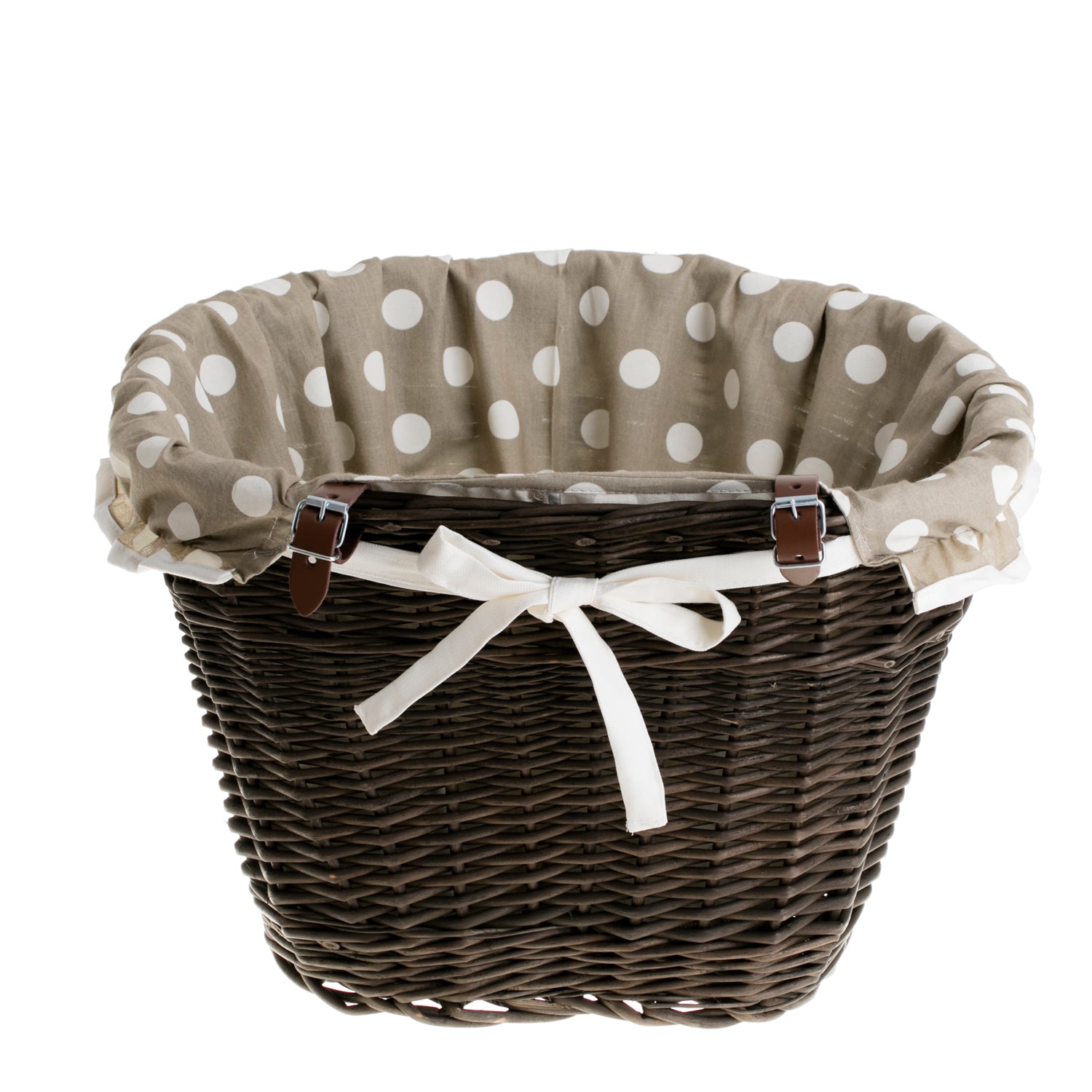Een elegante wilgenmand voor het stuur geeft je fiets klasse en een retro-uitstraling. Dicht gevlochten van donkerbruin wilg, heeft hij een stabiele, gelijkmatige rand en subtiel gevormde zijwanden. De binnenkant is gevoerd met zacht beige katoen en witte bies, welke je spullen beschermt en voorkomt dat ze tegen het vlechtwerk schuren. Kleine onregelmatigheden in het vlechtwerk benadrukken het unieke karakter van het handwerk.