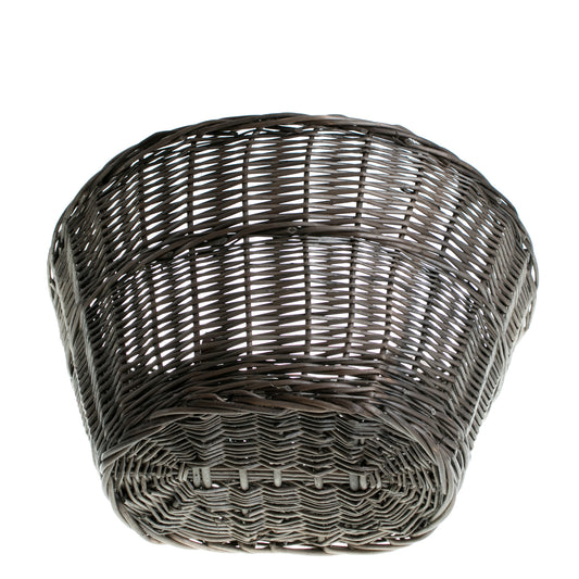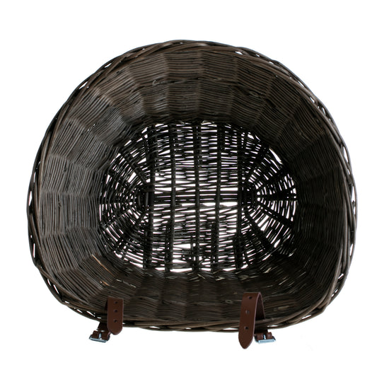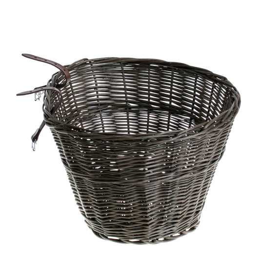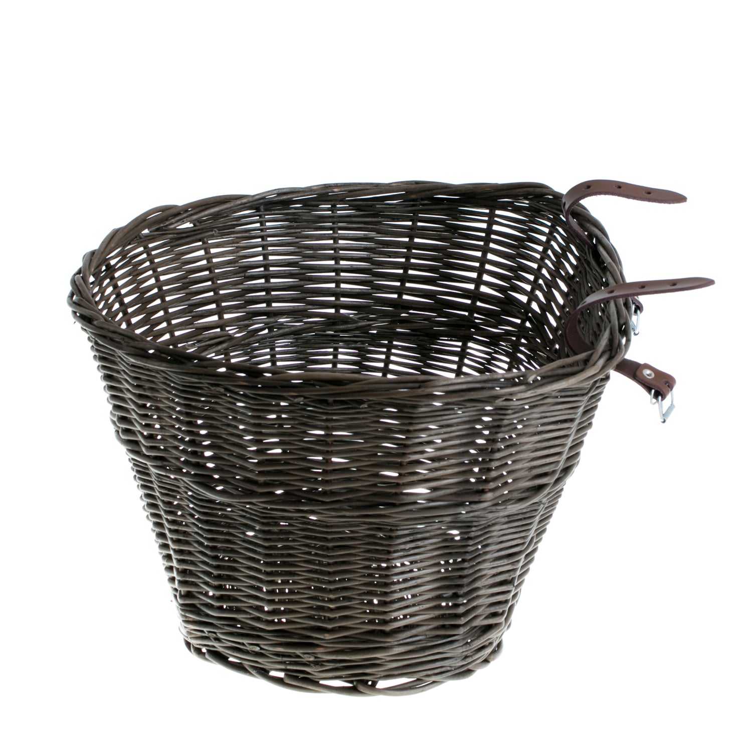 De mand heeft een klassieke, stedelijke uitstraling: boven breed en naar beneden taps toelopend, met een dicht en gelijkmatig vlechtwerk dat een elegante structuur geeft. Donkerbruin riet benadrukt het vintage karakter en past bij stadsfietsen en cruisers. De rand is stevig verstevigd voor extra stabiliteit en aan de voorkant zitten twee leren bandjes om aan het stuur te bevestigen. Licht afgeronde randen en zorgvuldig afgewerkte verbindingen verhogen het gebruikscomfort.