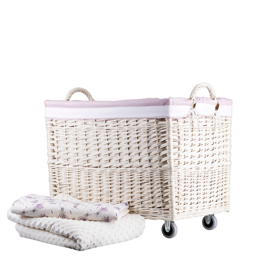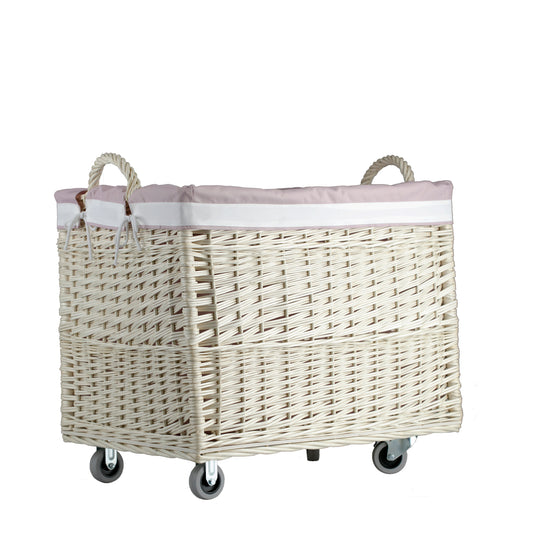 Jouw specificatie van Salux Rieten wasmand met roze bies, op wieltjes en met handvatten