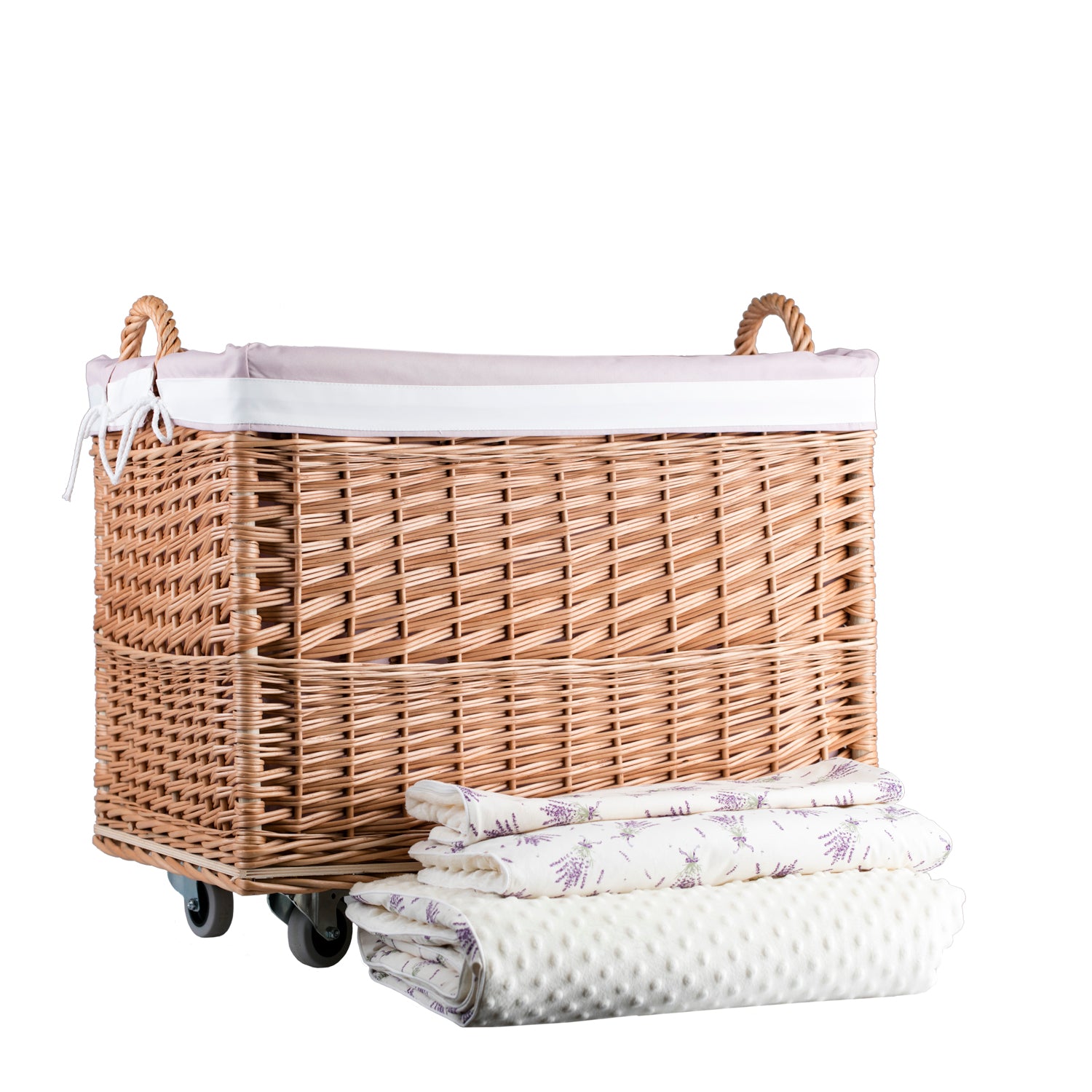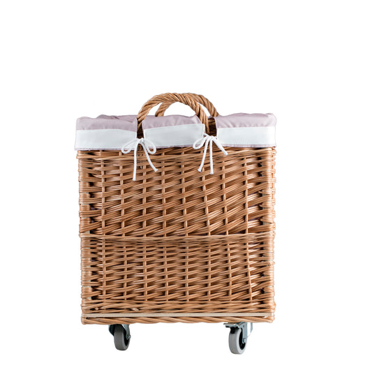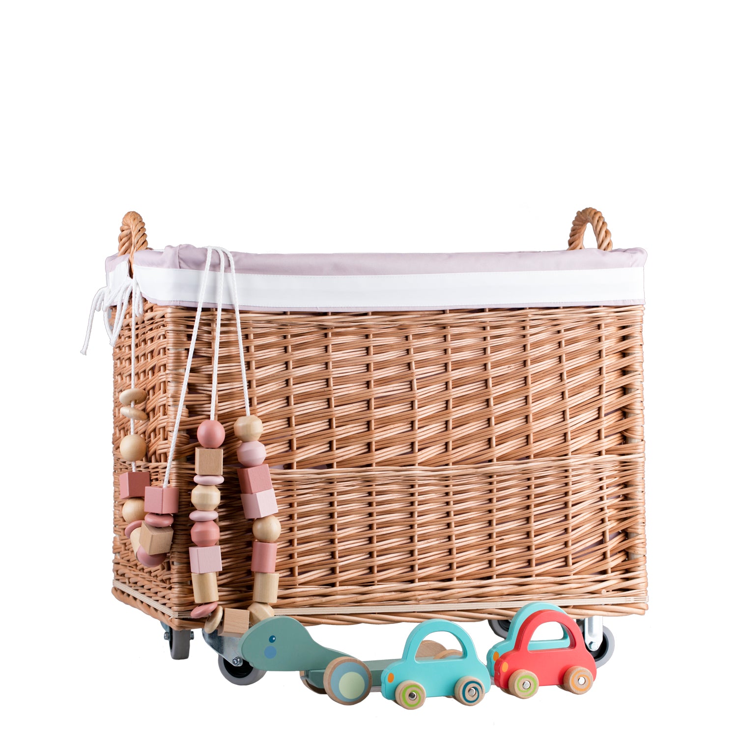Jouw specificatie van Salux rieten mandje met roze voering en wieltjes