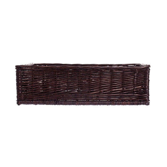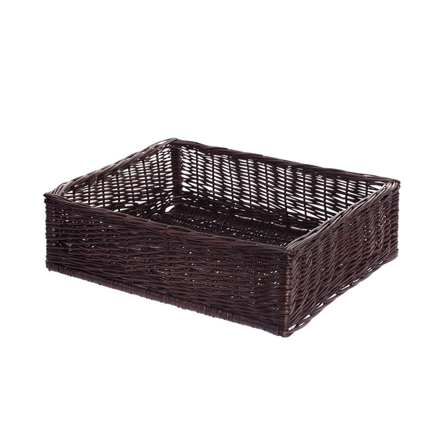 Rechthoekige presentatiemand van natuurlijk wilgenriet die imponeert met strakke lijnen en degelijke afwerking. De donkere wenge-kleur benadrukt elegantie, en de gelijkmatige, zorgvuldig gevlochten structuur vormt stabiele wanden en een versterkte, vlak afgewerkte rand. De bodem is dichter gevlochten voor grotere draagkracht en een gelijkmatige presentatie van de waren. Het model is open, zonder handvatten en zonder omboording, wat snelle toegang tot de inhoud vergemakkelijkt. De gevlochten spijlen creëren een fijne textuur die de natuurlijke nerf van het riet benadrukt.