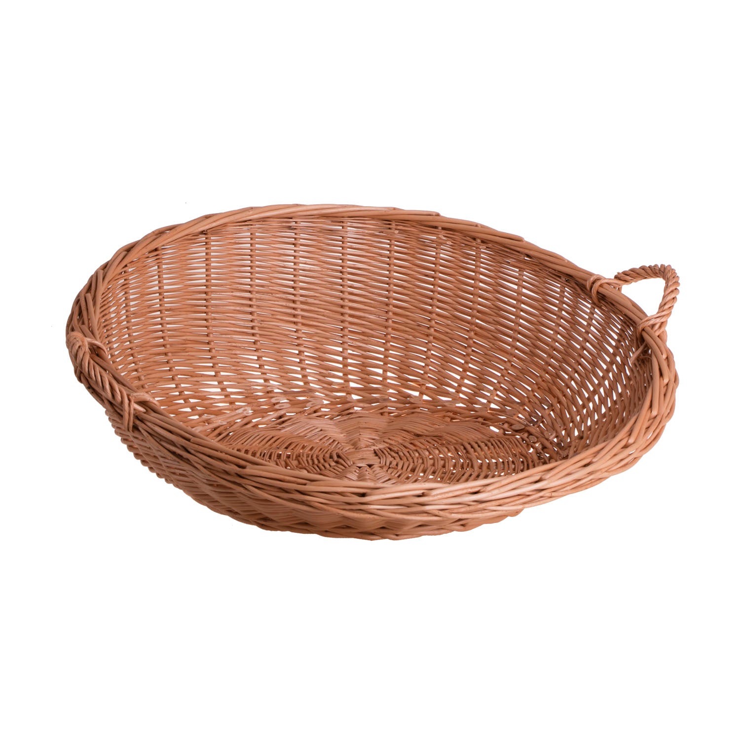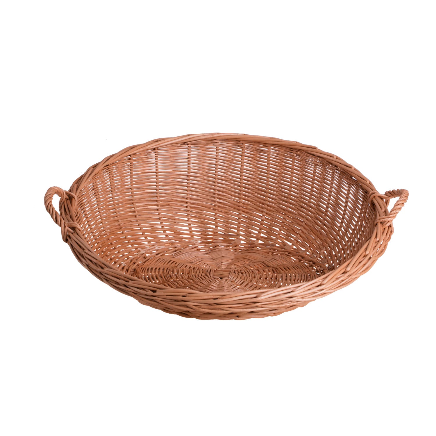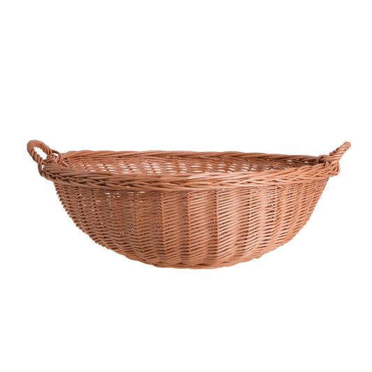 Deze ronde schaal van wilgentenen valt op door zijn natuurlijke, honingkleurige tint en een gelijkmatige, dichte vlecht. De verstevigde rand, gevlochten van een dikker stuk wilgentak, vormt een stabiele rand. Aan de zijkanten bevinden zich twee handige grepen die het dragen vergemakkelijken. De platte, stevig gevlochten bodem houdt de inhoud veilig op zijn plaats. De rand is afgewerkt met een decoratieve vlecht die elegantie toevoegt.