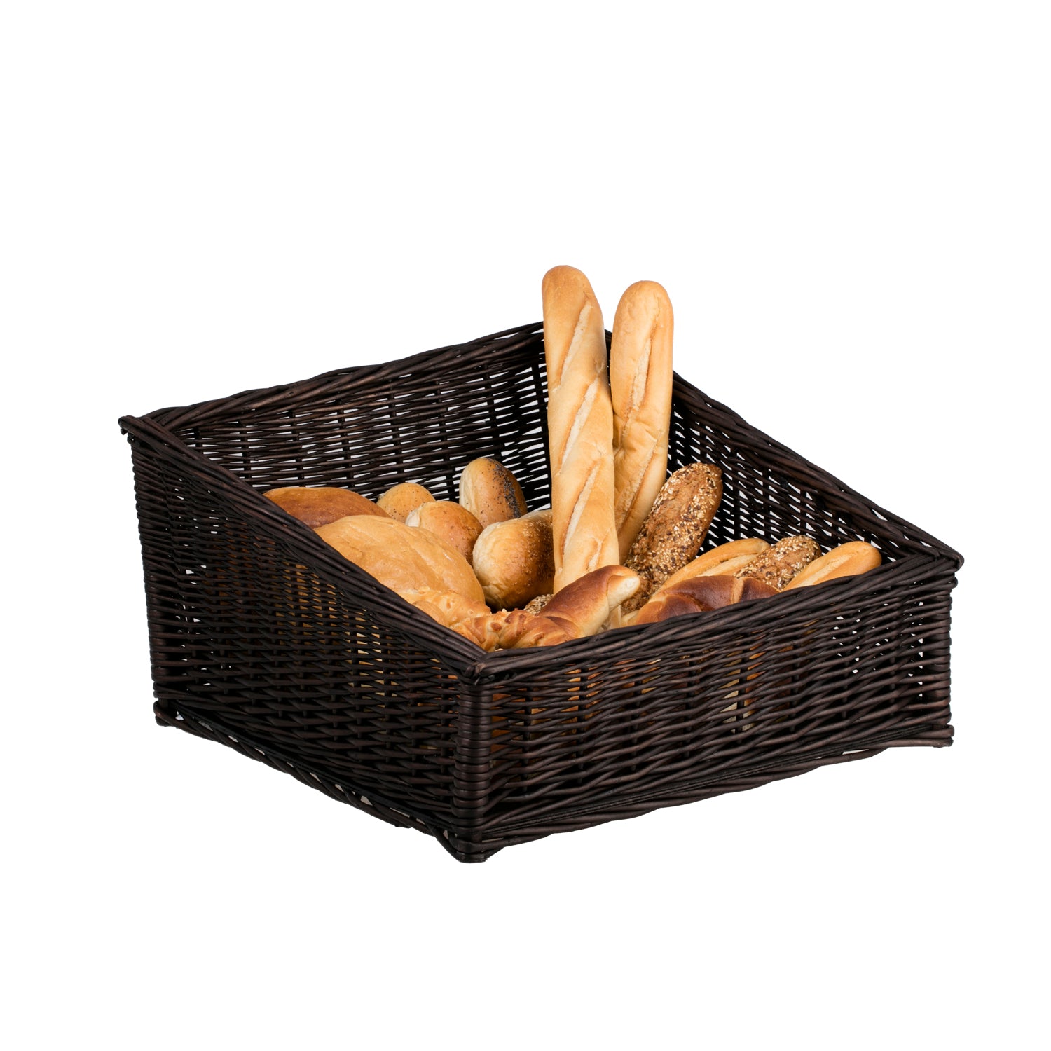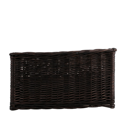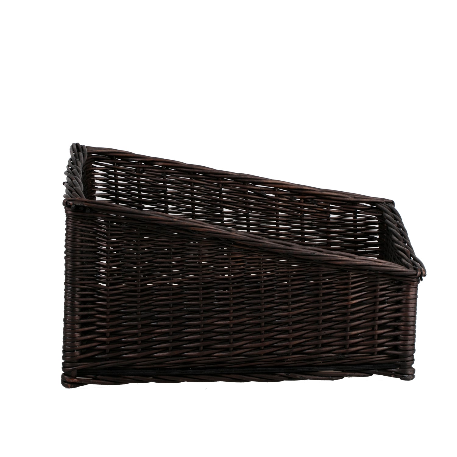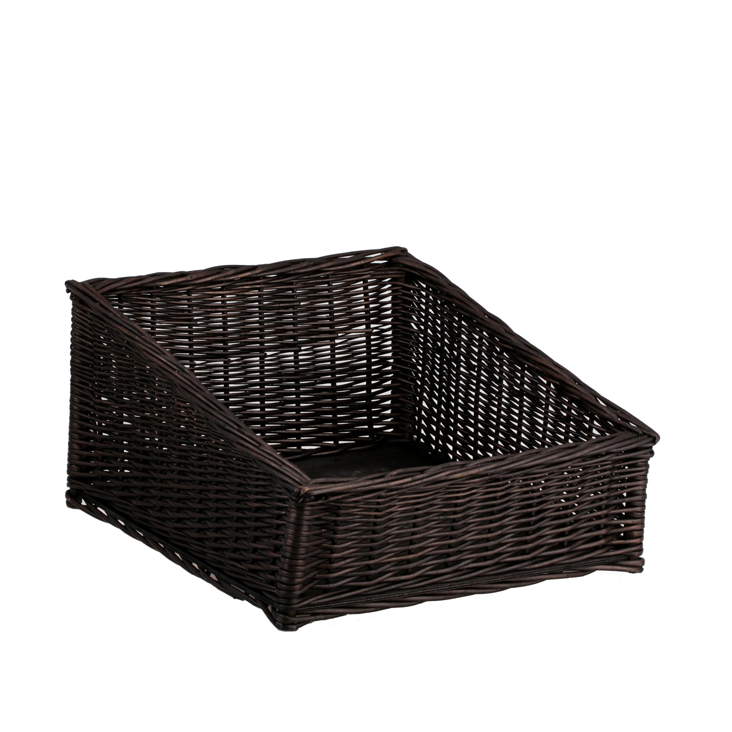 Elegante gevlochten displaymand van wilgentenen die opvalt door een diepe, donkerbruine wengé-kleur. Een dicht en gelijkmatig vlechtwerk vormt stevige wanden; achter is hoger en de voorkant verlaagd voor gemakkelijke toegang. De platte bodem zorgt voor stabiliteit op toonbanken of werkbladen. Het ontbreken van handvatten en afwerking benadrukt een strakke, professionele vorm.