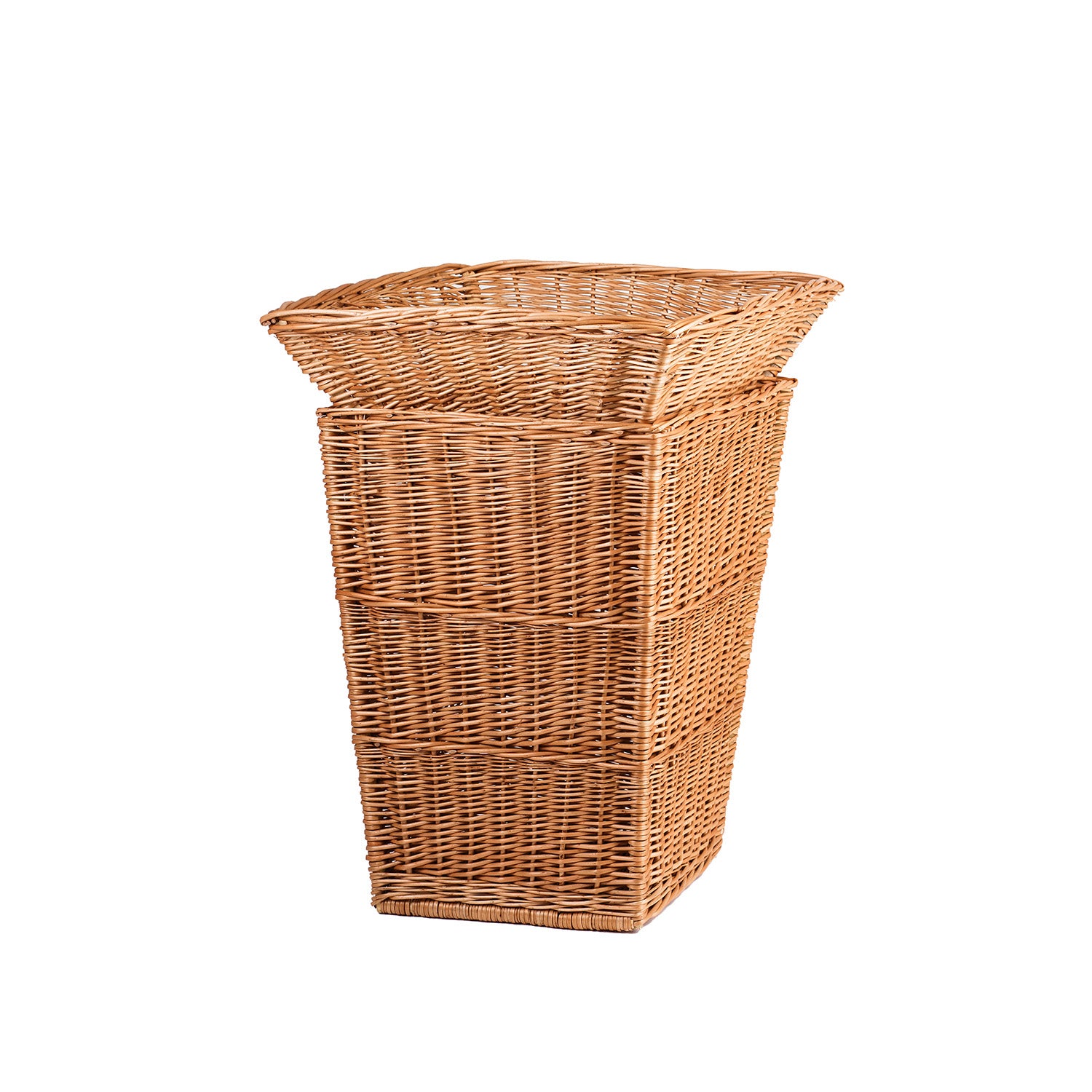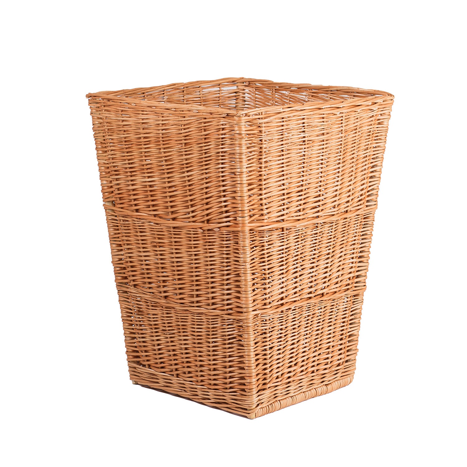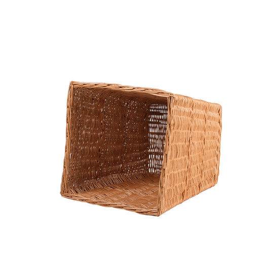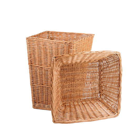 De hoge displaymand van wilgentenen onderscheidt zich door zijn slanke constructie en brede, licht uitlopende rand bovenaan, die de toegang tot de inhoud vergemakkelijkt. De verticale wanden vormen een dichte, gelijkmatige weving en de randen zijn zorgvuldig afgewerkt. Het ontbreken van handgrepen en biezen houdt de vorm opgeruimd, waardoor het product op elke kraam schoon en professioneel oogt.