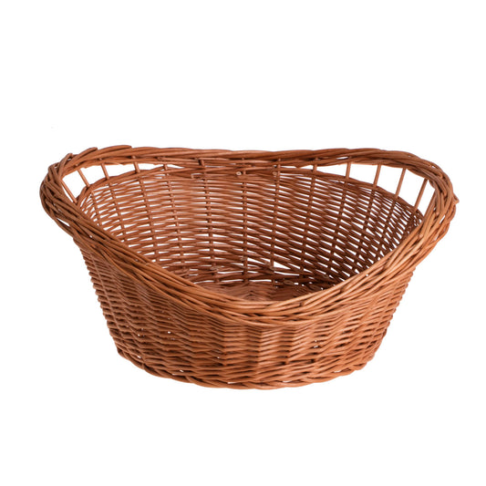 Een elegant, handgevlochten mand van wilgentenen in de vorm van een open schaal trekt de aandacht met het nobele vlechtpatroon. Een brede, gevormde rand omsluit de inhoud stevig en twee uitsparingen voor handvatten zijn discreet in de rand geïntegreerd, zodat de mand makkelijk vast te pakken en comfortabel te dragen is. De dicht gevlochten bodem biedt betrouwbare ondersteuning en de vloeiend afgewerkte rand benadrukt het vakmanschap. Afgeronde uiteinden van de stokken voelen glad aan en een stevige rand geeft het geheel een harmonieuze, decoratieve lijn.