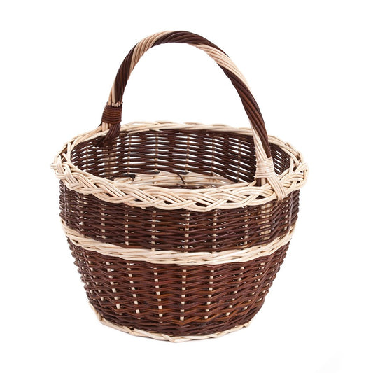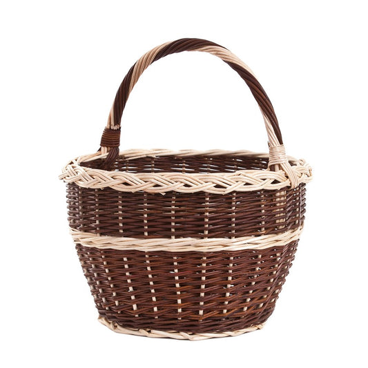 Deze wilgenmand valt op door een elegante tweekleurige vlecht: donkerbruin verweeft zich met licht crème wilg en creëert een chique contrast. De rand wordt bekroond door een decoratieve vlecht, en in het midden loopt een sierlijke band die het licht uitstaande profiel accentueert. Een stevige, gebogen handgreep, omwonden in twee tinten, zorgt voor een veilige grip. Dichte wanden, gladde randen en een stabiele bodem verhogen het gebruiksgemak; de mand heeft geen bekleding of deksel.