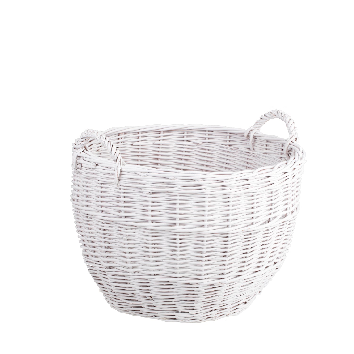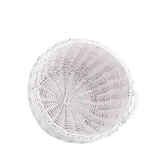 Elegante witte rieten mand in een klassieke ronde vorm, die betovert met een gelijkmatig, fijn vlechtwerk. De wanden bestaan uit dicht gevlochten stokken en de bovenrand is zorgvuldig afgewerkt en verstevigd voor meer stabiliteit. Twee handige handvatten, gevlochten van hetzelfde riet, zorgen voor een stevige greep en comfortabel dragen, zelfs als de mand vol is.