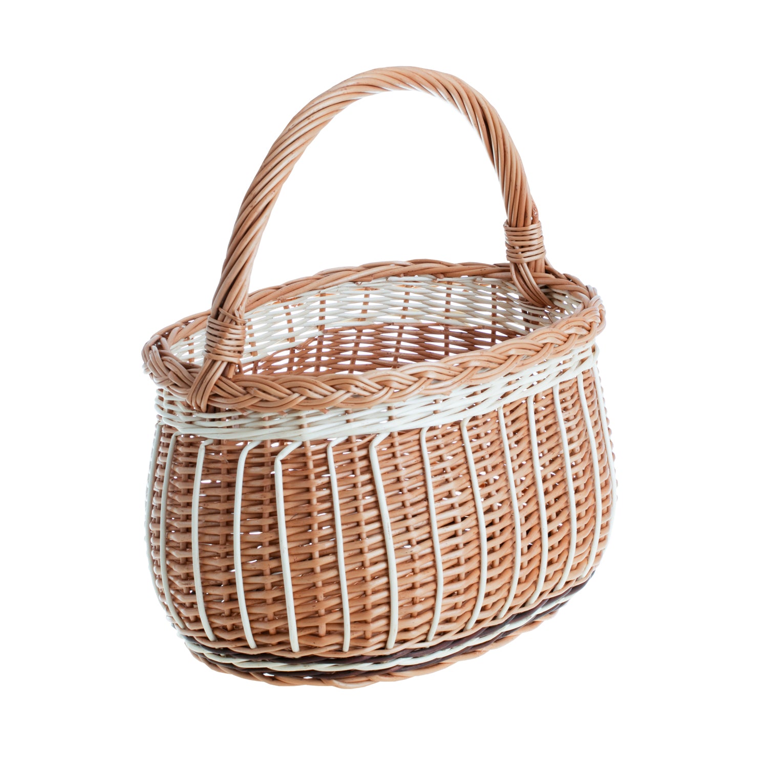 Deze gevlochten boodschappenmand trekt de aandacht met natuurlijke elegantie en zorgvuldig vlechtwerk. Hij heeft een zacht afgerond, ruim lichaam en een stevige, gebogen handgreep die prettig in de hand ligt. De rand is afgewerkt met een decoratieve vlecht, en verticale staven en een lichte band zorgen voor luchtigheid. Het dicht gevlochten vlechtwerk behoudt de vorm en beschermt de inhoud. Afmetingen ca. 35×25 cm, hoogte 22/36 cm (met handgreep).