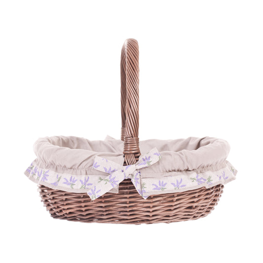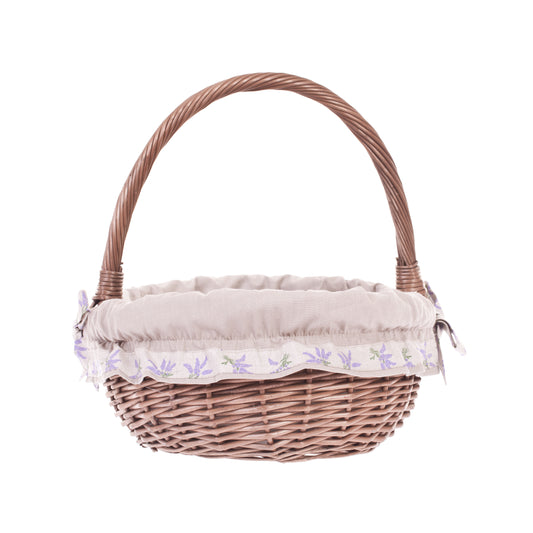 Een klassieke, handgeweven rieten mand in een donkere bruine tint die betovert met zijn natuurlijke uitstraling. Hij heeft een hoog, stevig handvat voor gemakkelijk dragen en een dichte, gelijkmatige vlecht die stabiliteit garandeert. De binnenkant is gevoerd met een zachte, crèmekleurige stof met een subtiel kantje en strikjes die elegantie toevoegen en de inhoud beschermen tegen schuren.