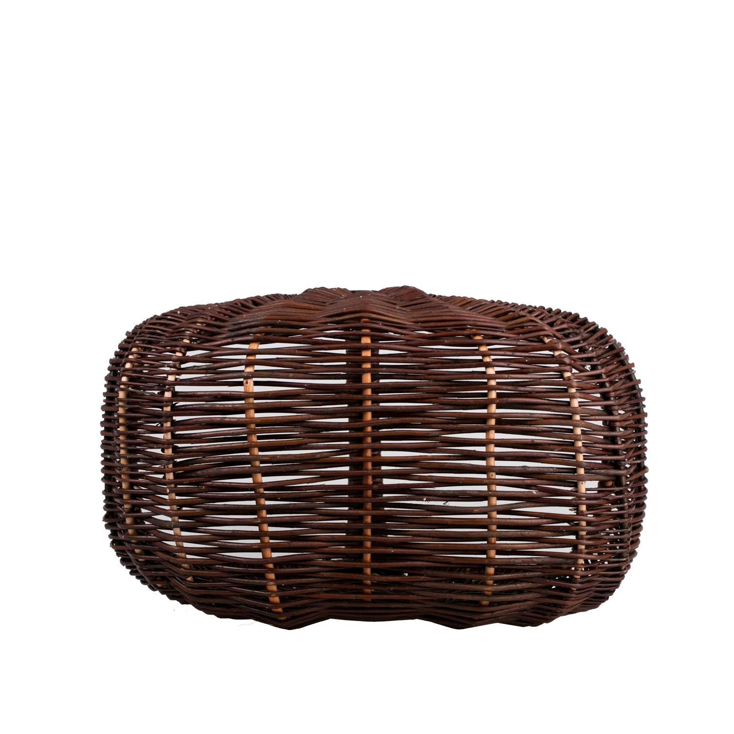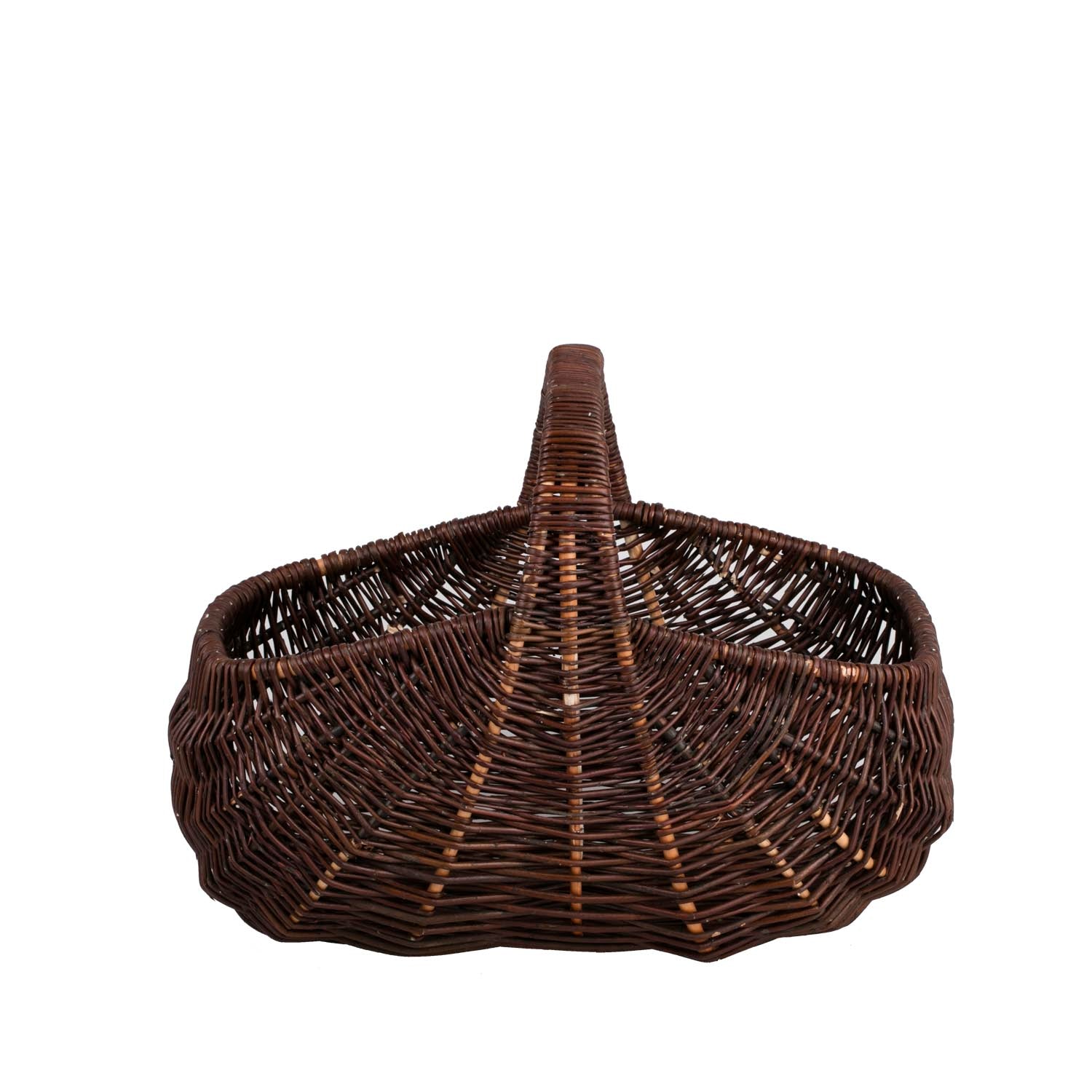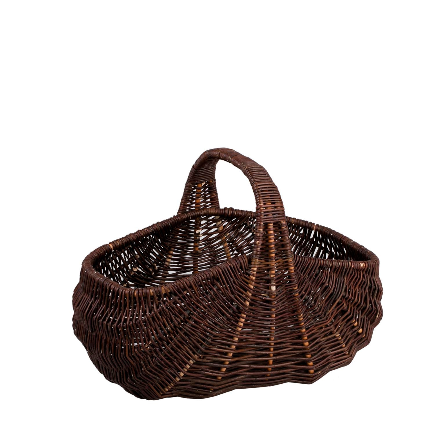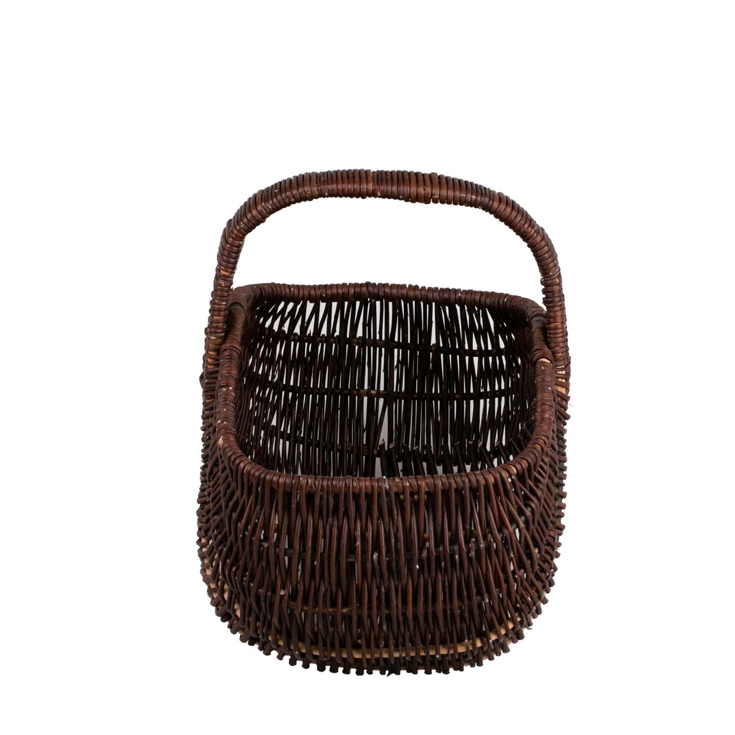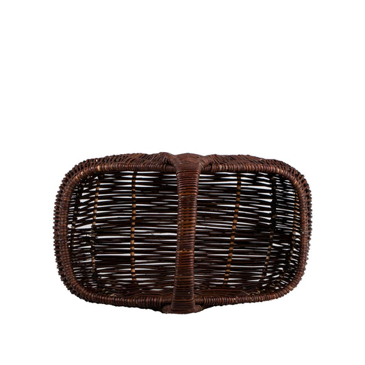 Een elegante rieten mand valt op door zijn diepe donkerbruine tint. Hij heeft een ruim, gevormd lichaam en een hoog, stabiel handvat dat is verbonden met een netjes afgewerkte rand. Het gelijkmatige, stevige vlechtwerk en de verstevigingen die van de bodem naar het handvat lopen geven lichtheid en duurzaamheid. Afgeronde randen voelen prettig aan en zijn veilig voor de inhoud.