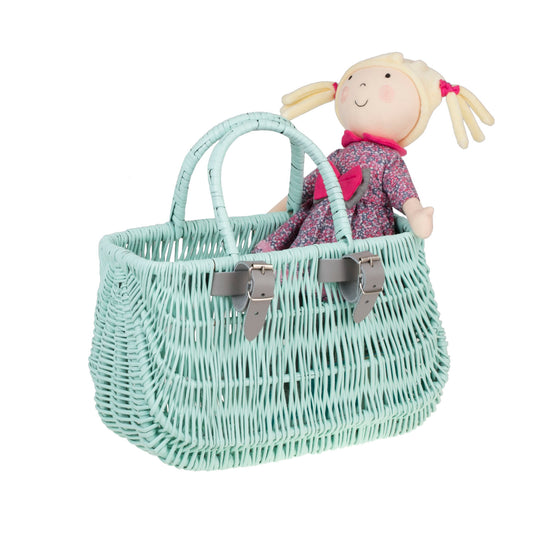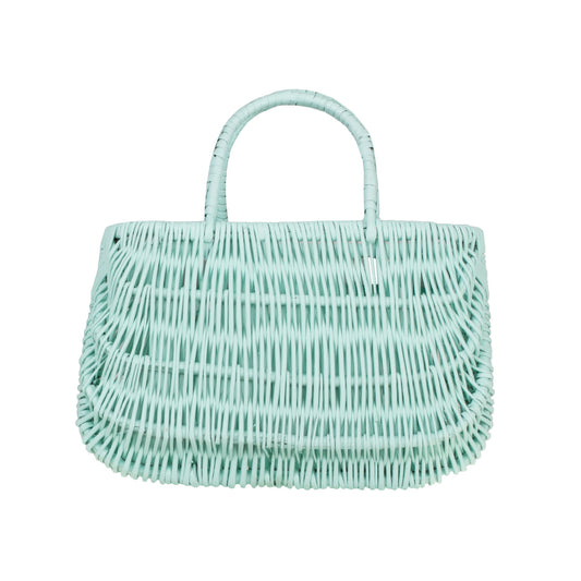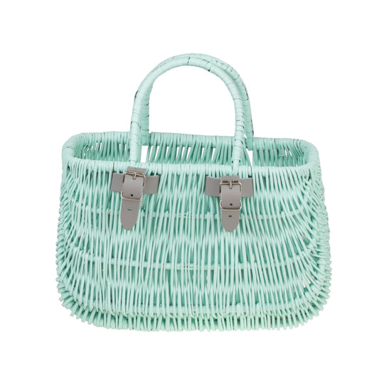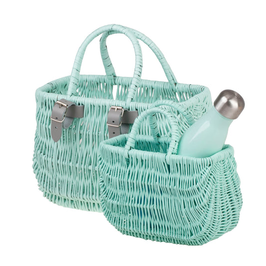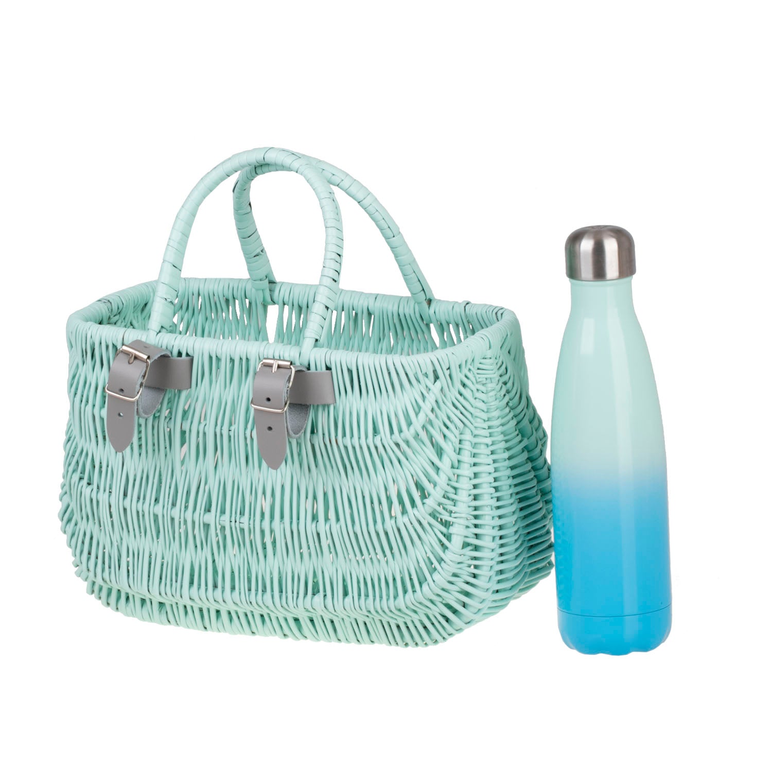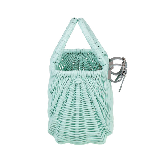 De pastel mintkleur en de zacht gevormde lijnen geven de mand een retro-charme. Een dicht vlechtwerk met regelmatige, flexibele stokken benadrukt de esthetiek en aandacht voor detail. Aan de voorkant bevinden zich twee verstelbare riemen met gespen voor montage aan het stuur, en bovenaan maken twee korte handvaten het dragen gemakkelijk.