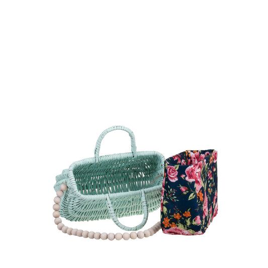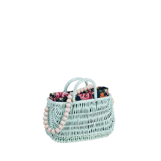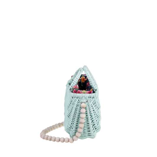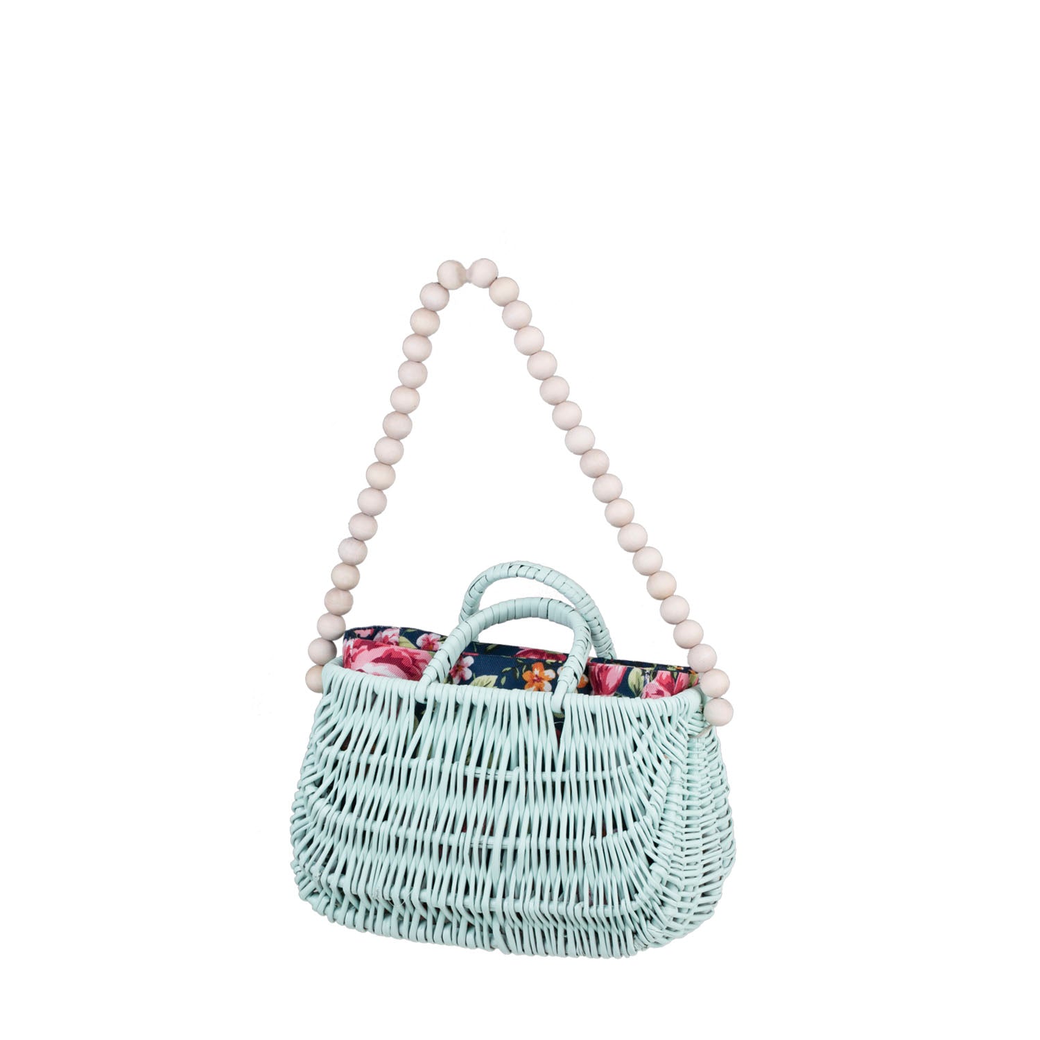 Klein maar opvallend, deze gevlochten rieten schoudertas in mintkleur betovert met een subtiele golvende vlecht en een vrouwelijke lijn. Twee ronde handvatten maken comfortabel dragen in de hand mogelijk, terwijl een lange schouderriem van houten kralen hem over de schouder laat dragen. De binnenkant is afgewerkt met een donkerblauwe stoffen bekleding die de inhoud ordent en beschermt. Afgeronde randen en een gelijkmatig handgevlochten weefsel vormen een harmonisch en elegant geheel.