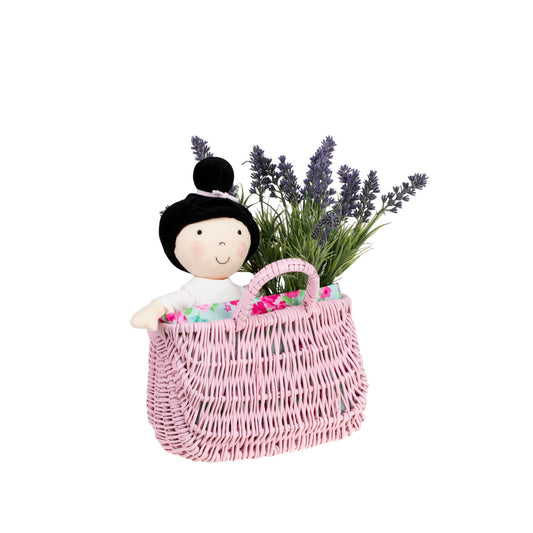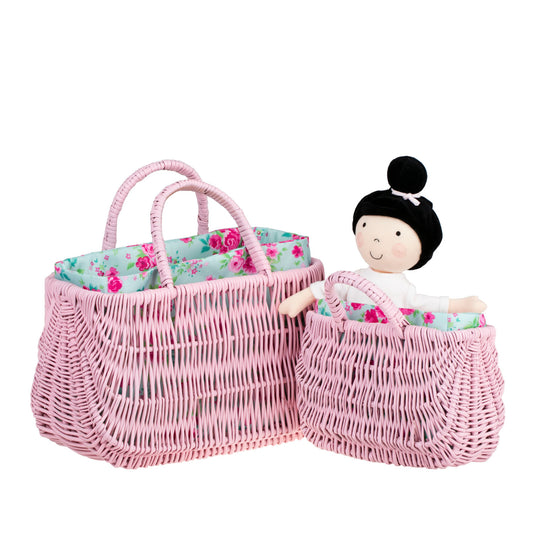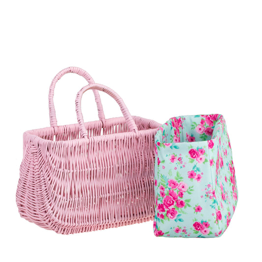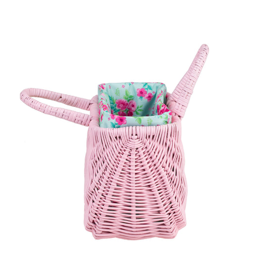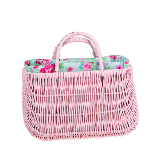 Deze kleine, vrouwelijke tas-mand valt op door pastelroze wilgentenen en een zorgvuldig, gelijkmatig vlechtwerk. De bovenkant is afgewerkt met een zachte, muntkleurige stofbies die subtiel contrasteert met de kleur van de mand. Afgeronde randen, een glad afgewerkte rand en elegante verticale openingen geven het geheel een lichte uitstraling. Een stevige, ronde wilgenhengsel maakt dragen gemakkelijk.