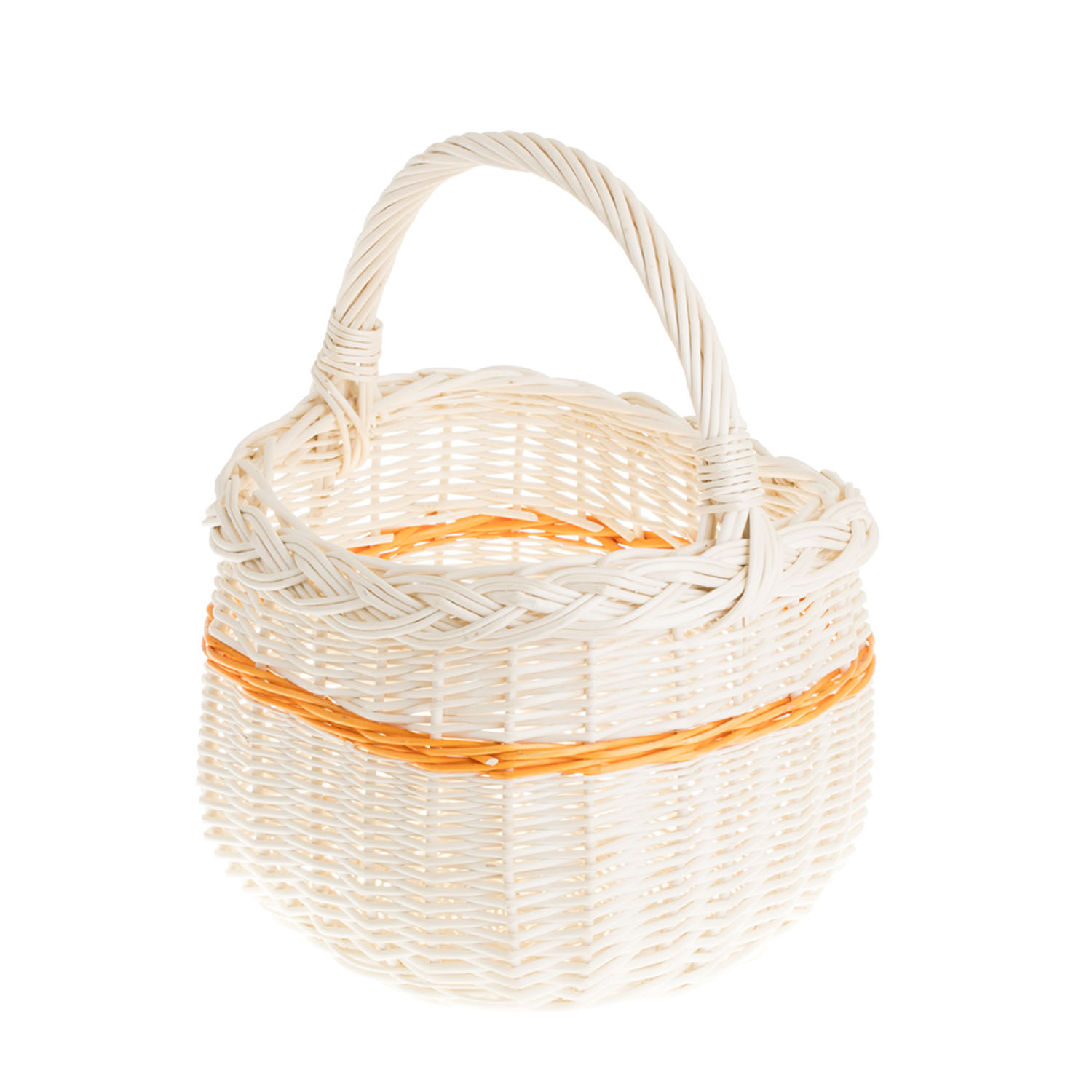 Elegante gevlochten rieten boodschappentas in een crèmekleur, verfraaid met een subtiele honingkleurige band rond het lichaam. De bovenkant is afgewerkt met een decoratieve, met de hand gevlochten vlecht die tegelijk de rand versterkt. De slanke, ovale vorm en het hoge, stevig gemonteerde handvat maken de mand licht, handzaam en prettig om te dragen. Zonder voering en sluiting.