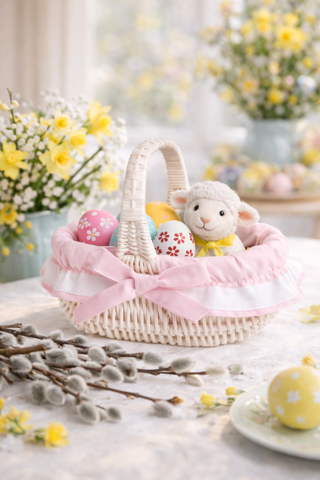 Kies voor Europees vakmanschap – bestel deze gevlochten paaskorf van wilg met roze bies en geniet jarenlang van een duurzame, ecologische decoratie.