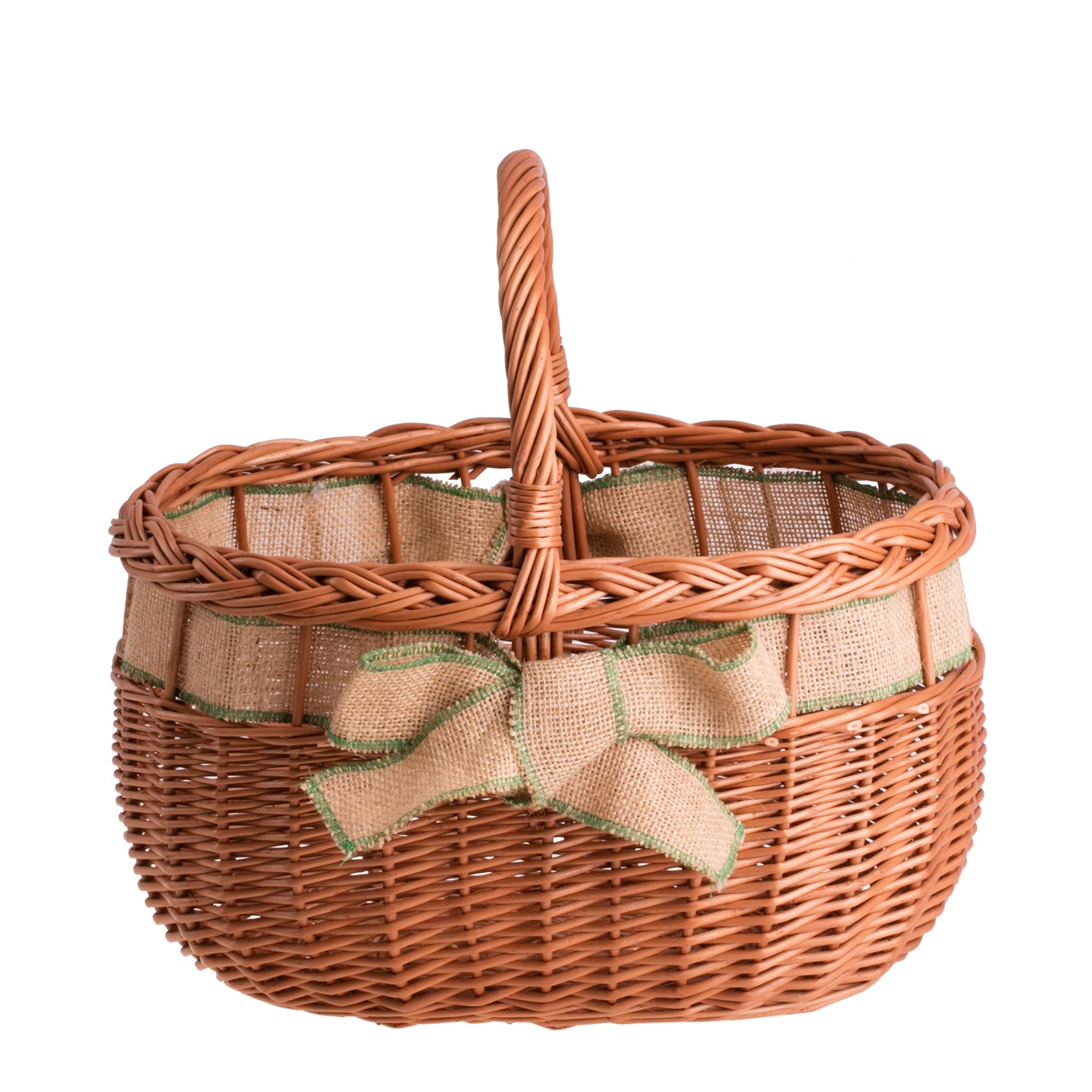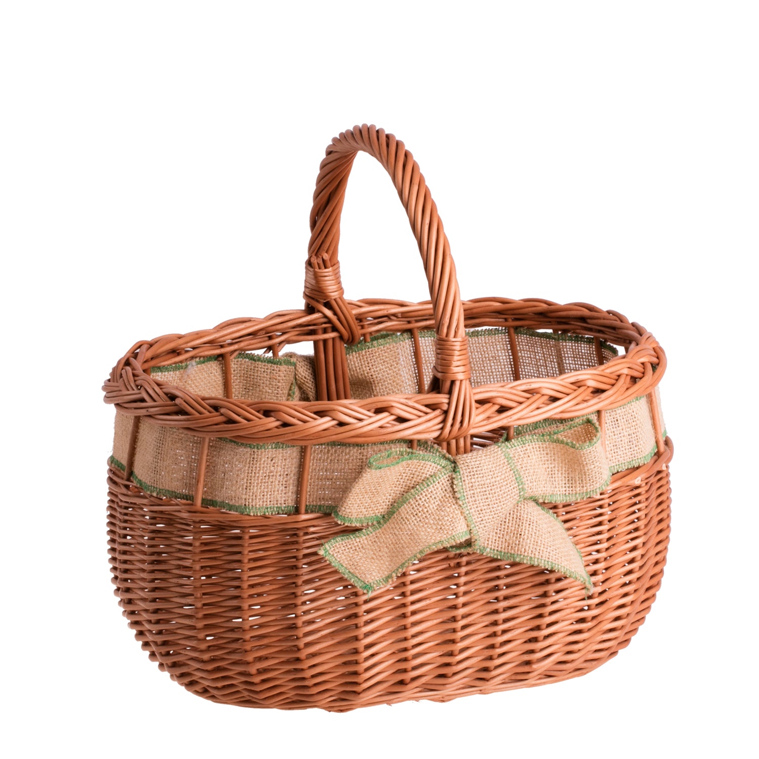 De klassieke rieten mand valt op door zijn elegante vlechtwerk en verfijnde details. De ovale vorm van het lichaam gaat over in een decoratieve, dubbele vlecht langs de rand en het stevige, gebogen handvat zorgt voor een betrouwbare grip. Langs de rand loopt een jute afwerking met een subtiel groen biesje en een decoratieve strik, die rustieke charme toevoegen. De natuurlijke, warme tint van het riet zorgt dat de mand harmonieus past bij verschillende interieurstijlen en kleding.