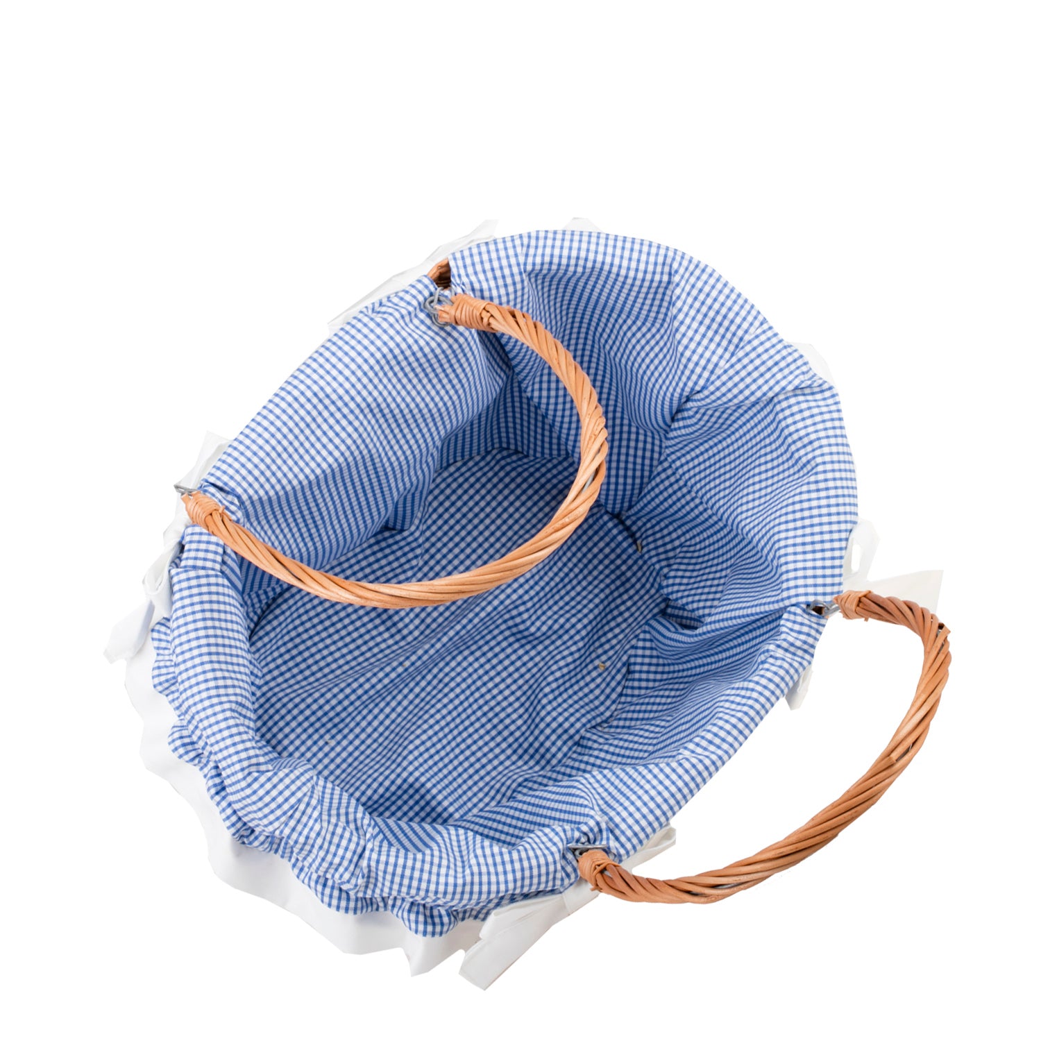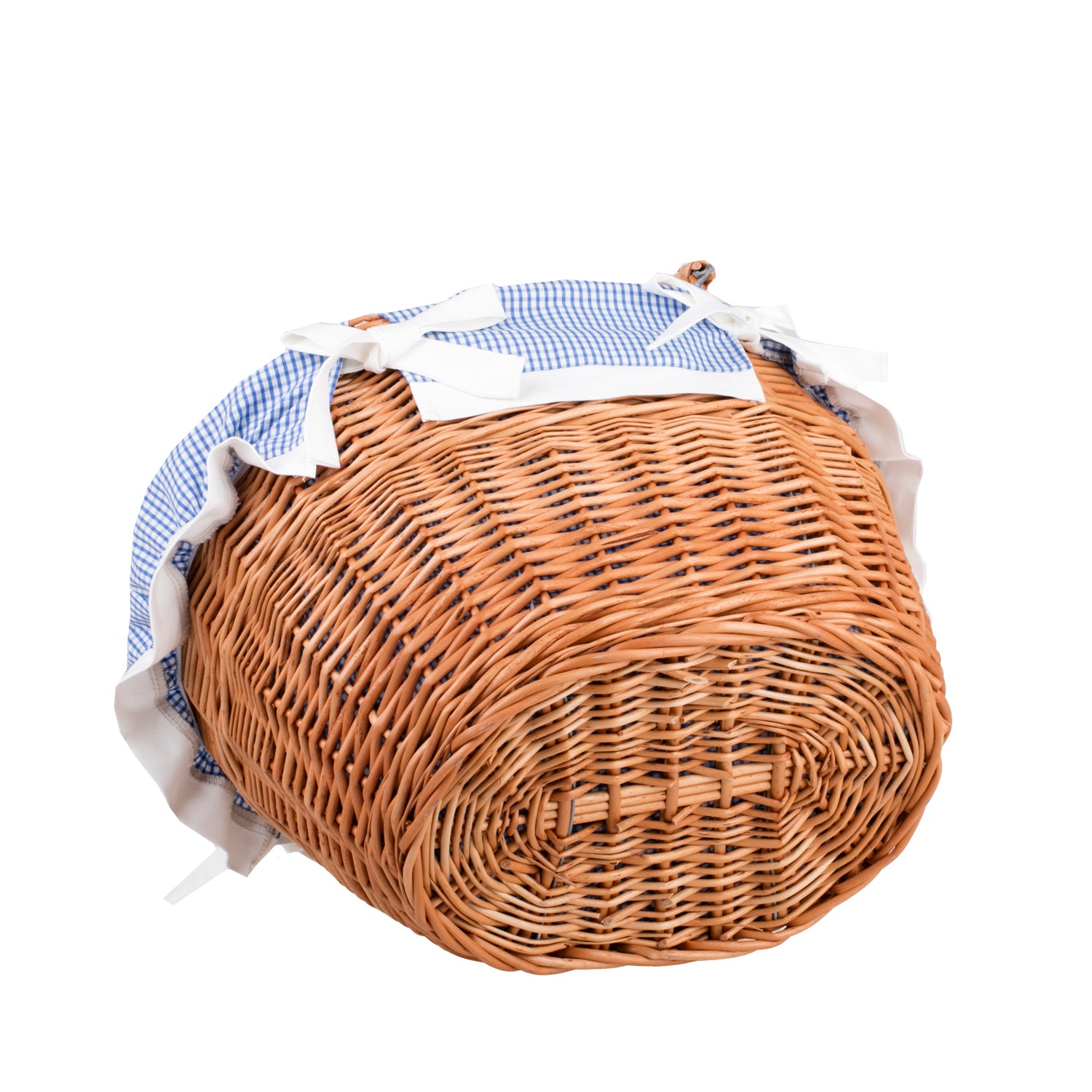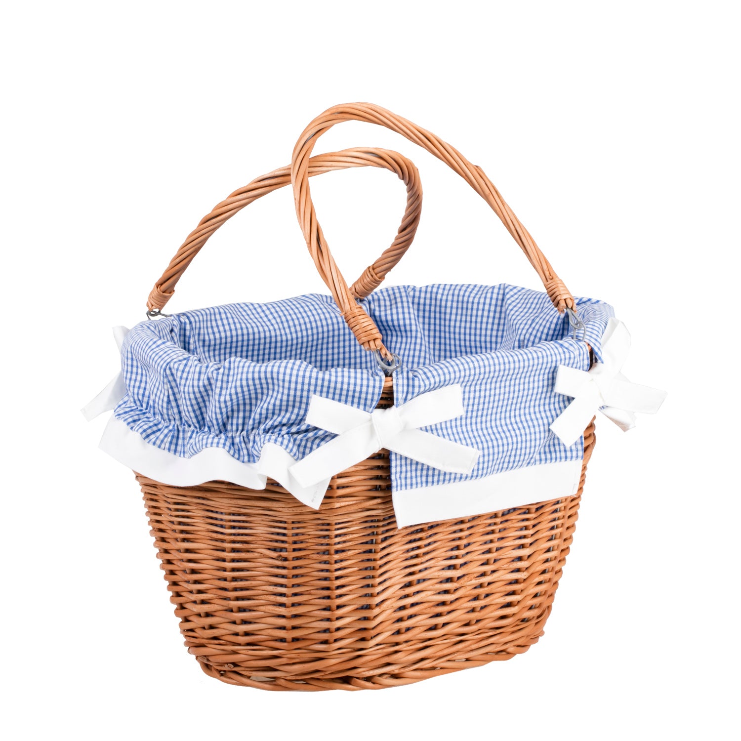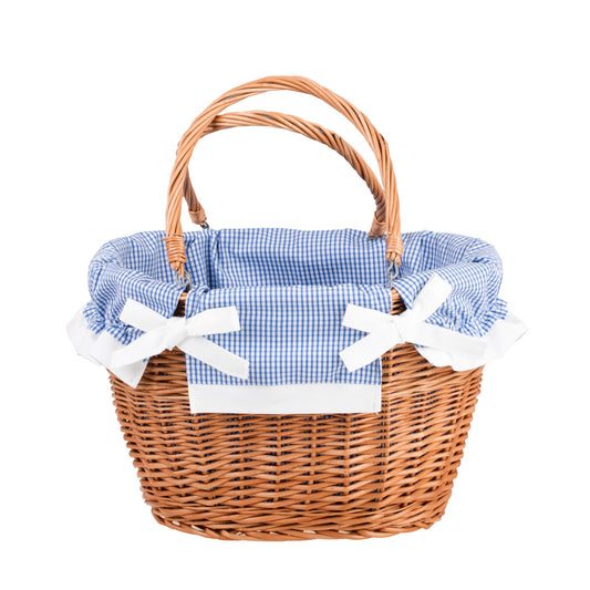 De klassieke gevlochten boodschappenkorf van wilgentenen valt op door het nauwkeurige vlechtwerk en de warme, natuurlijke afwerking. Hij heeft twee stevige handvatten verbonden met metalen bevestigingen die prettig in de hand liggen. De binnenkant is gevoerd met blauwe katoen met witte bies en trekkoordjes, die de inhoud en de rand van de mand beschermen. De ovale vorm biedt veel ruimte zonder onnodig gewicht, en het gelijkmatige vlechtwerk geeft een elegante uitstraling.