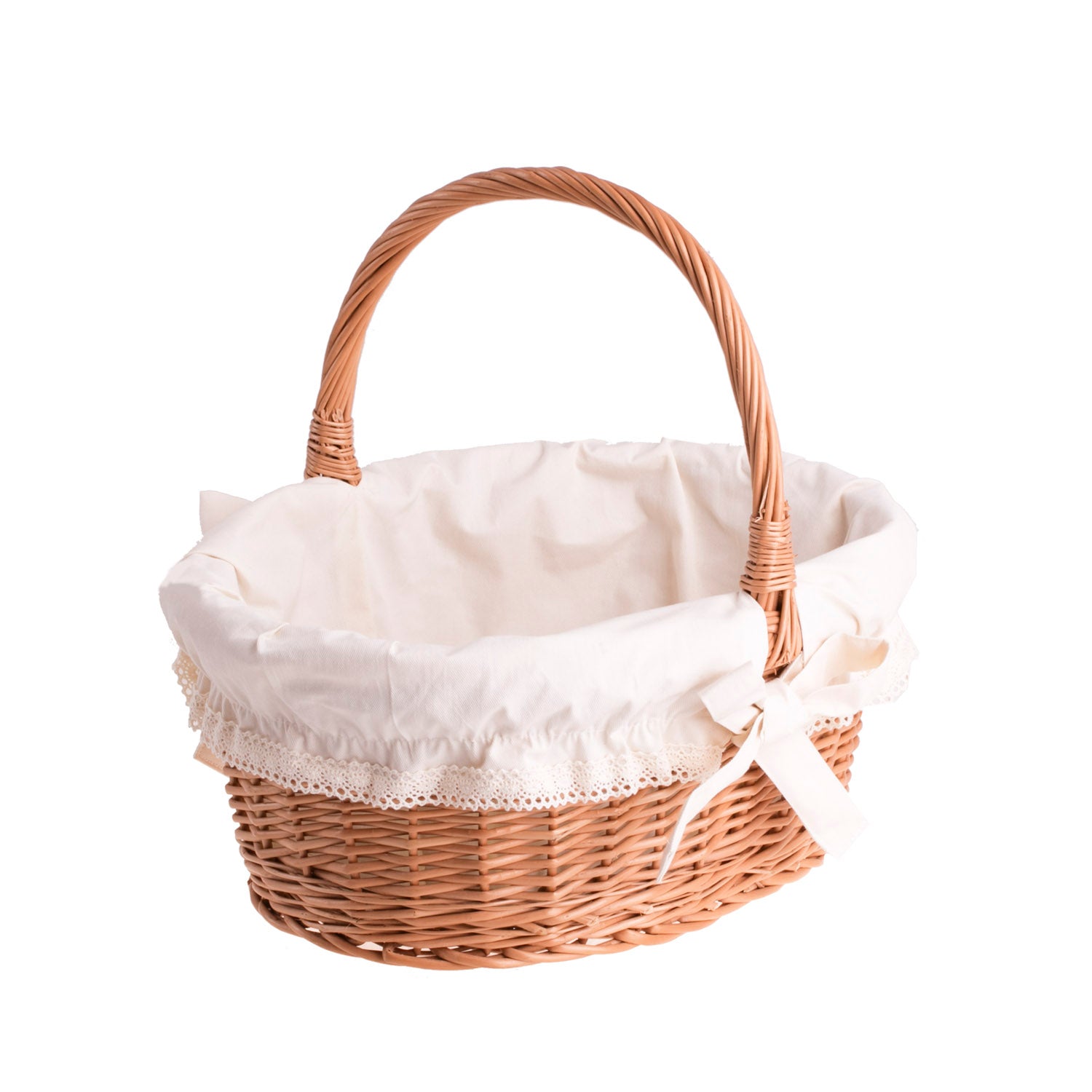 Een elegante geschenkmand van natuurlijk riet valt op door zijn verzorgde uitstraling. Hij heeft een klassieke, licht langwerpige vorm en een stevige handgreep die prettig in de hand ligt. De binnenkant is afgewerkt met een zachte, crèmekleurige katoenen voering, versierd met subtiele kant en een strik. Zorgvuldig vlechtwerk zorgt voor een harmonieus patroon, en gladde randen en een mooi omgeslagen rand geven het geheel lichtheid en stijl. Deze mand is op zichzelf al een decoratie.