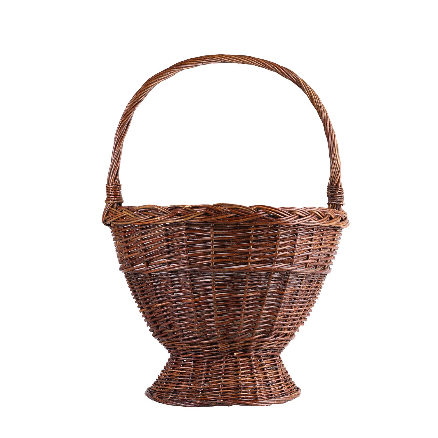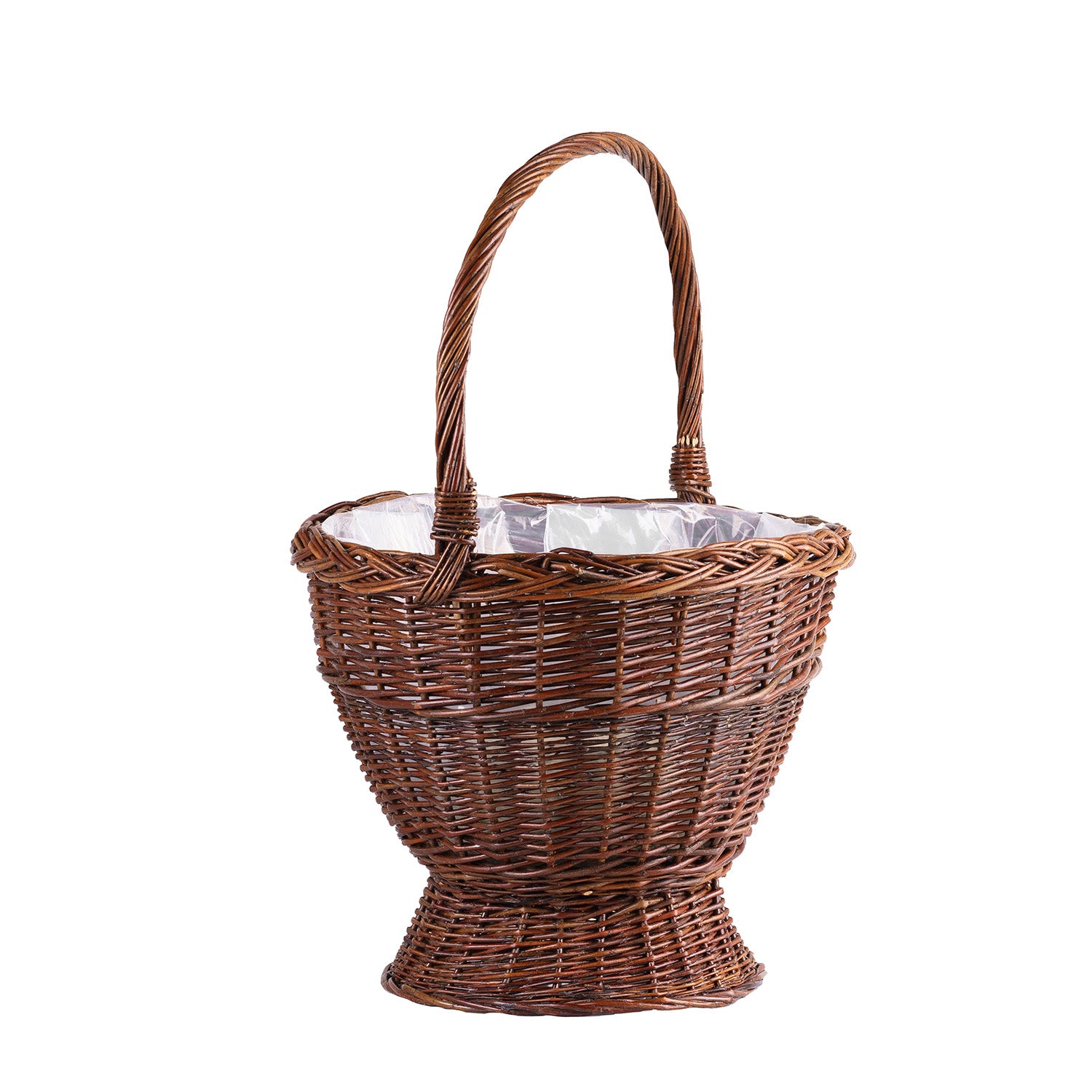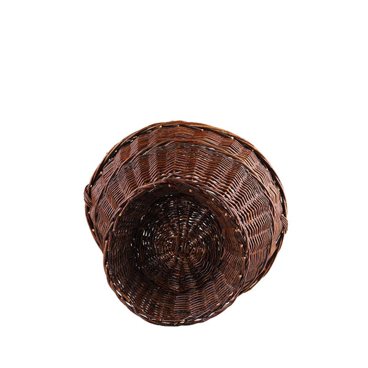 Deze rieten mand valt op door zijn elegante, ambachtelijke afwerking en donkere bruine kleur. Het hoge, gedraaide handvat is stevig bevestigd en de bovenrand is versierd met een decoratieve vlecht. Het korpus heeft een brede opening, een smallere onderkant op een stabiele voet en een gelijkmatige, dichte vlecht. Binnenin zit een transparante folie die beschermt tegen vocht.