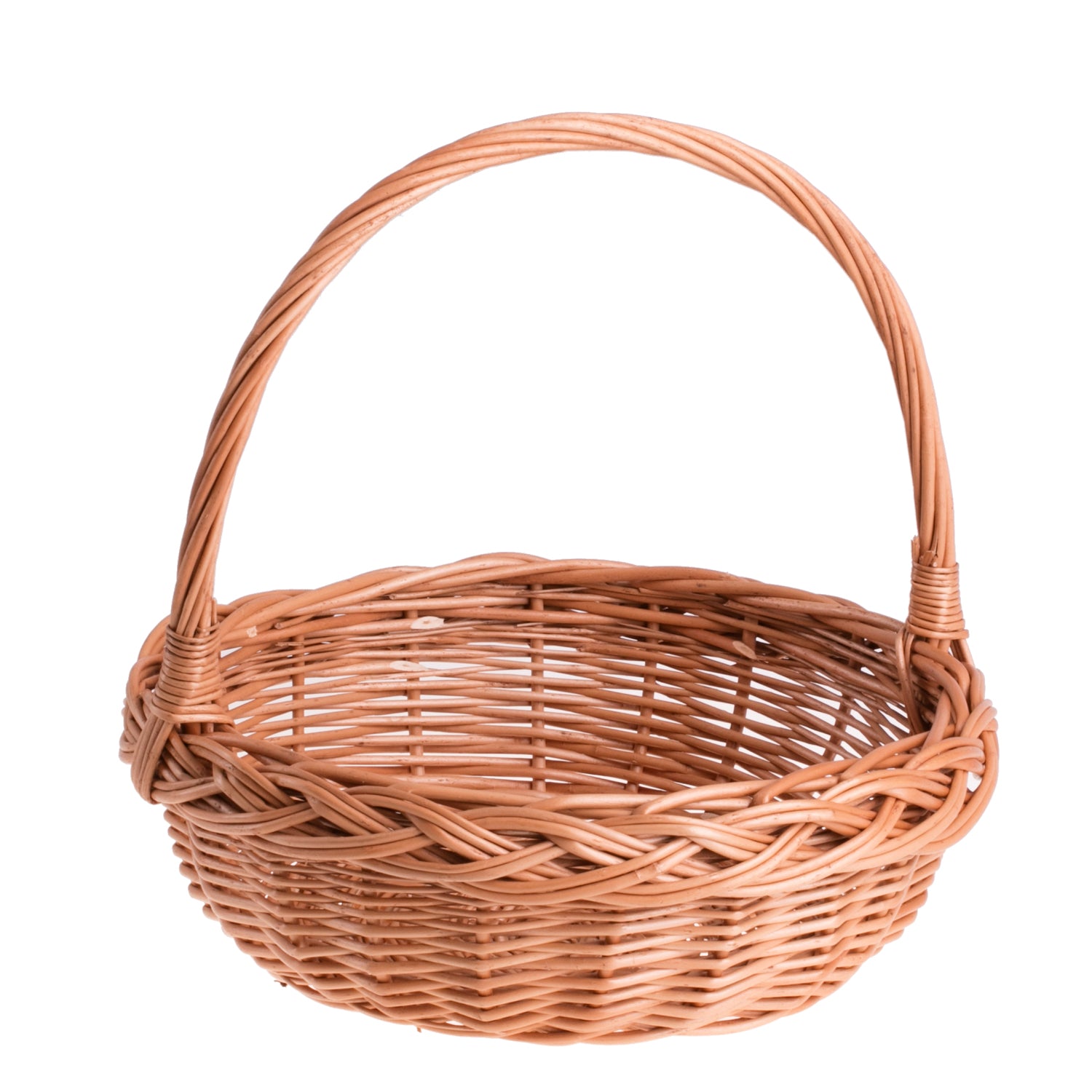 Een klassieke ronde rieten mand die betovert met strakke lijnen en vakkundige afwerking. Hij heeft een lage gevlochten rand, gedecoreerd met een sierlijke vlecht, en een hoge, gebogen handgreep die stevig aan de basis is omwikkeld. De vlecht is gelijkmatig en dicht, en de bodem stevig verstevigd. De natuurlijke, warme tint van het riet geeft een huiselijke uitstraling. De rand verstevigt de constructie en het ontbreken van voering en deksel maakt de mand uitzonderlijk licht.