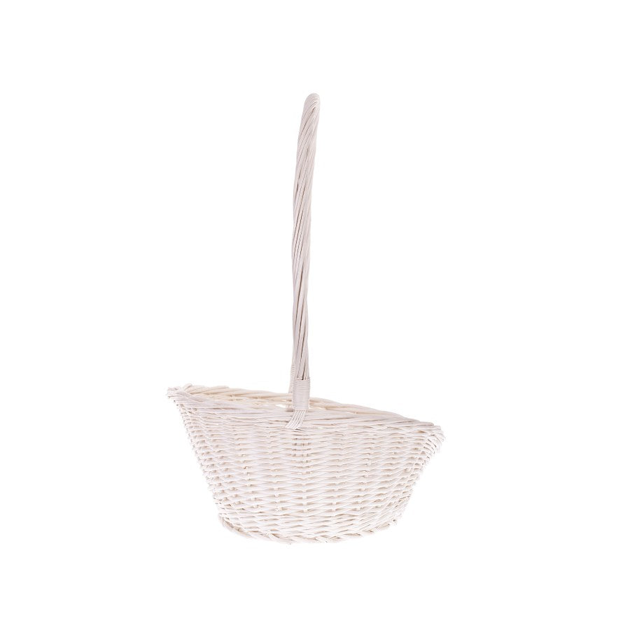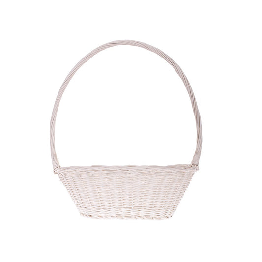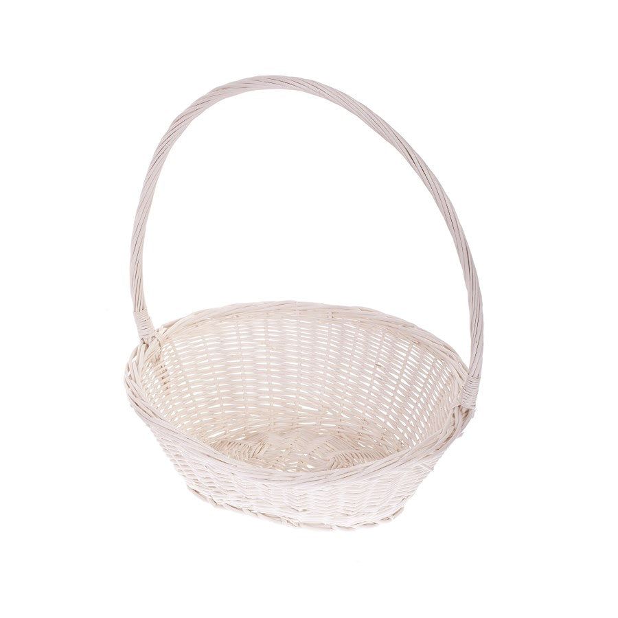 Deze elegante rietmand heeft een licht ovale vorm met een iets verhoogde achterzijde die de inhoud mooi tentoonstelt. Het oog valt op het hoge, stevige handvat in boogvorm, dat het dragen en rangschikken van composities vergemakkelijkt. De crèmekleur geeft een luchtige uitstraling en de gelijkmatige, dichte vlecht benadrukt de precisie van het vakmanschap. De rand is afgewerkt met een decoratieve vlecht en de bodem is stabiel, zodat de mand stevig op tafel staat.