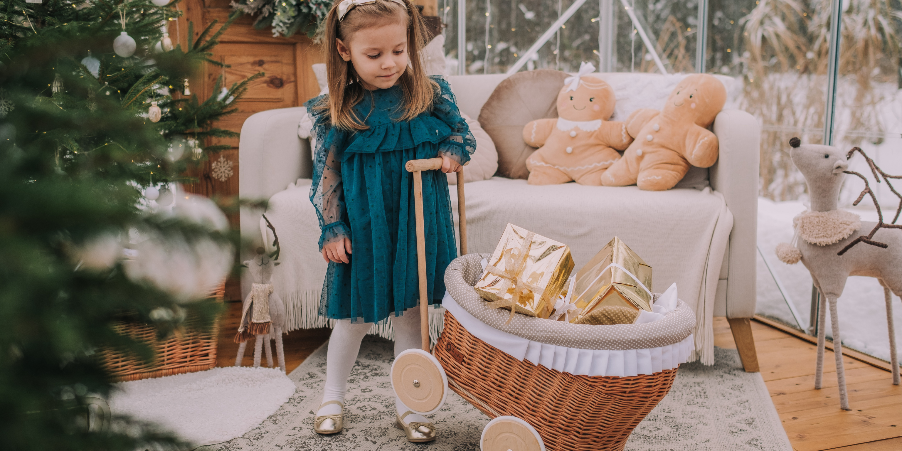 Lili wiklinowy wózek dla lalek z szarym obszyciem, kołderką i poduszką TheWickerStories