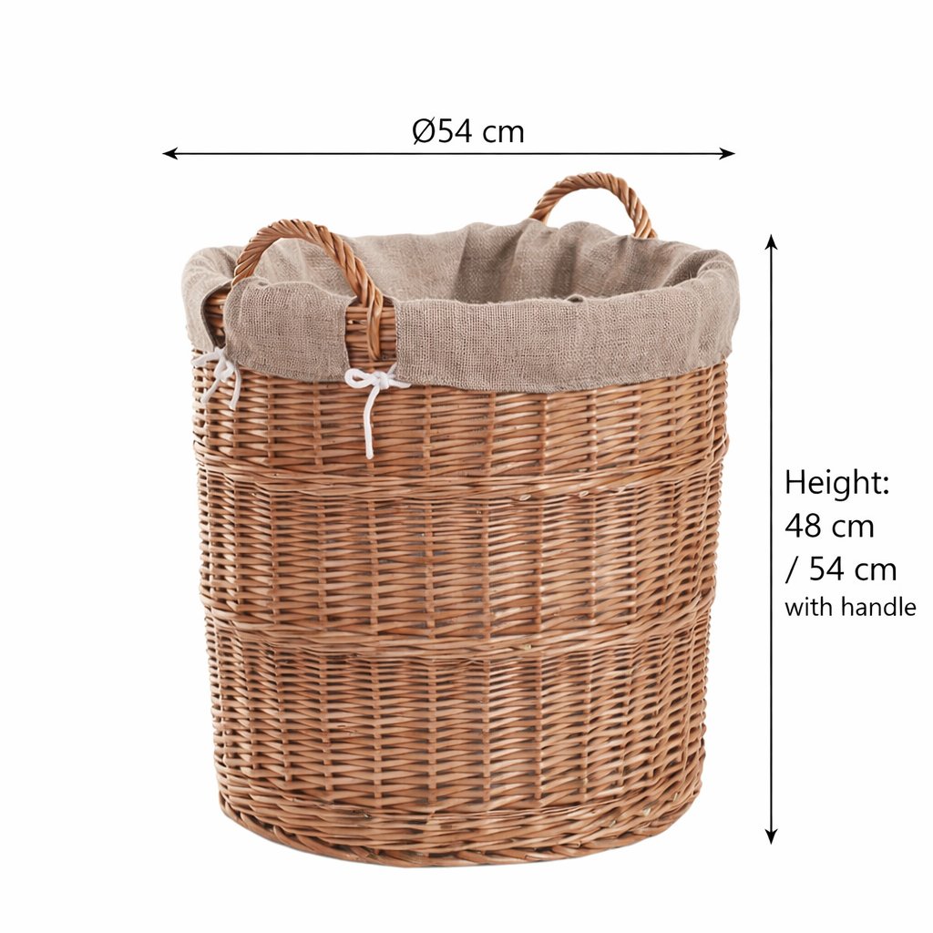 Okrągły kosz z naturalnej wikliny łączy solidny wygląd z ponadczasową prostotą. Gęsty, równy splot tworzy stabilne dno i mocny rant, który dobrze trzyma formę. Po bokach znajdują się praktyczne uchwyty ułatwiające przenoszenie. Wnętrze wykończono jutowym obszyciem z koronką(wiązany na troczki), które miękko chroni zawartość i estetycznie maskuje wnętrze kosza.