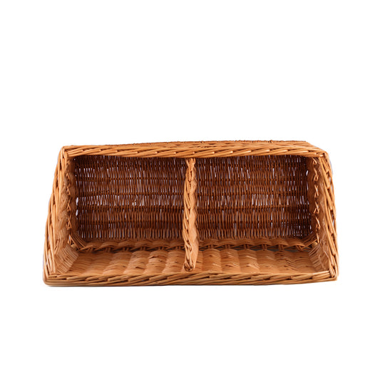 Wiklinowy kosz z przegrodą – solidność i porządek w naturalnym stylu to funkcjonalne rozwiązanie do ekspozycji długiego pieczywa w pionie. Prostokątna forma oraz praktyczna przegroda dzieląca wnętrze na dwie części pozwalają uporządkować zawartość i estetycznie ją zaprezentować. Naturalny, miodowy odcień wikliny harmonizuje z wypiekami, a gęsty splot tworzy równe, sztywne ścianki.